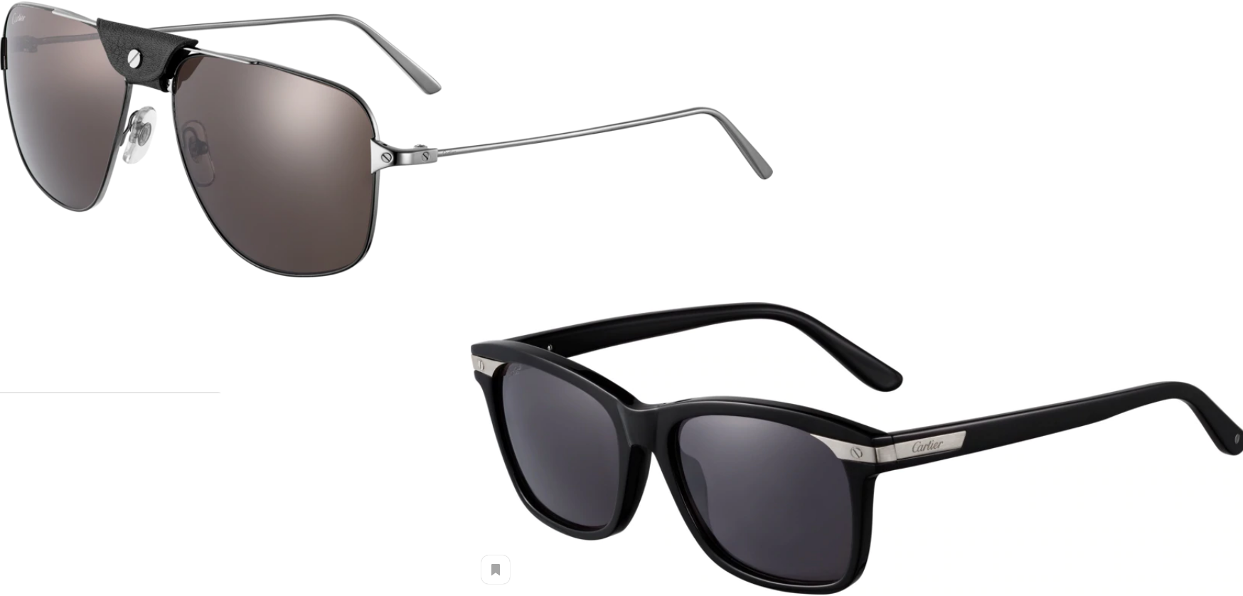 Cartier uzmanlarına göre, bir erkeğe özgün bir tarz yaratmada gözlük en önemli detay. Alıcılar arasında sürekli talep gören, çok aranan birkaç güneş gözlüğü var. Bunlar aşağıdaki koleksiyonları içerir: Santos De Cartier, Panthere De Cartier, İmza Cartier, Premiere De Cartier.