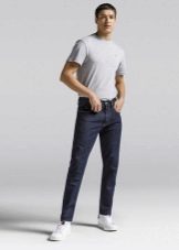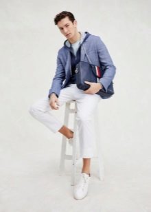 - Arkadaşlarla yürüyüş yapmak için, daha yakından inceleyebilirsiniz. deniz stilinde beyaz kot pantolon ve tişört ile hafif bir görünüm. Böyle bir yay kesinlikle rahatlığı seven ve asgari olarak kendilerine çok fazla dikkat çeken erkeklere hitap edecek. Görüntüdeki son rötuşlar, kontrast oluşturan bir beyzbol şapkası ve tabii ki beyaz spor ayakkabılar veya mokasenler olabilir.
