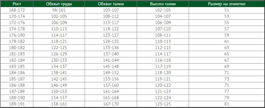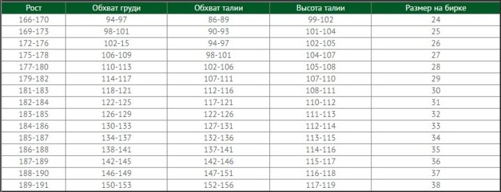 - sen - normal yapılı erkekler için beden aralığı 24-32, orantılı olarak katlanmış, yüksekliği 1,62 m'nin altında.