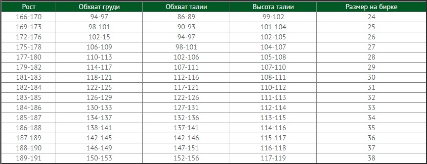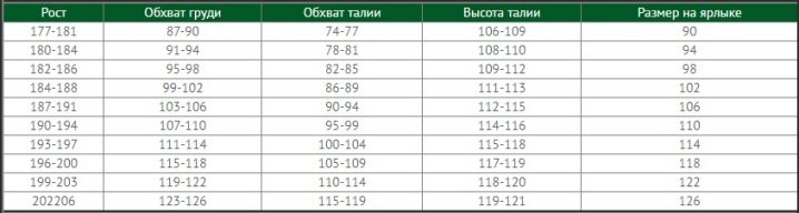- S - beli göğüs çevresinden çok daha küçük olan atletik ve uzun boylu erkekler. Manşonun açıkça kısa olmasına rağmen, normal bedenler geniş görünebilir. Bu yapı için 1,79 m'den başlayan büyümeyi ve 88-114 arası boyutları dikkate alın.