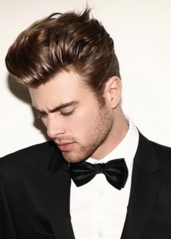 - Elvis. Bir rock'n roll yıldızı tarzındaki modaya uygun stil, traş edilmiş tapınaklara ve uzun bir ön direğe sahiptir. Patlamalar genellikle geri taranır.