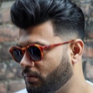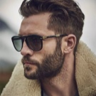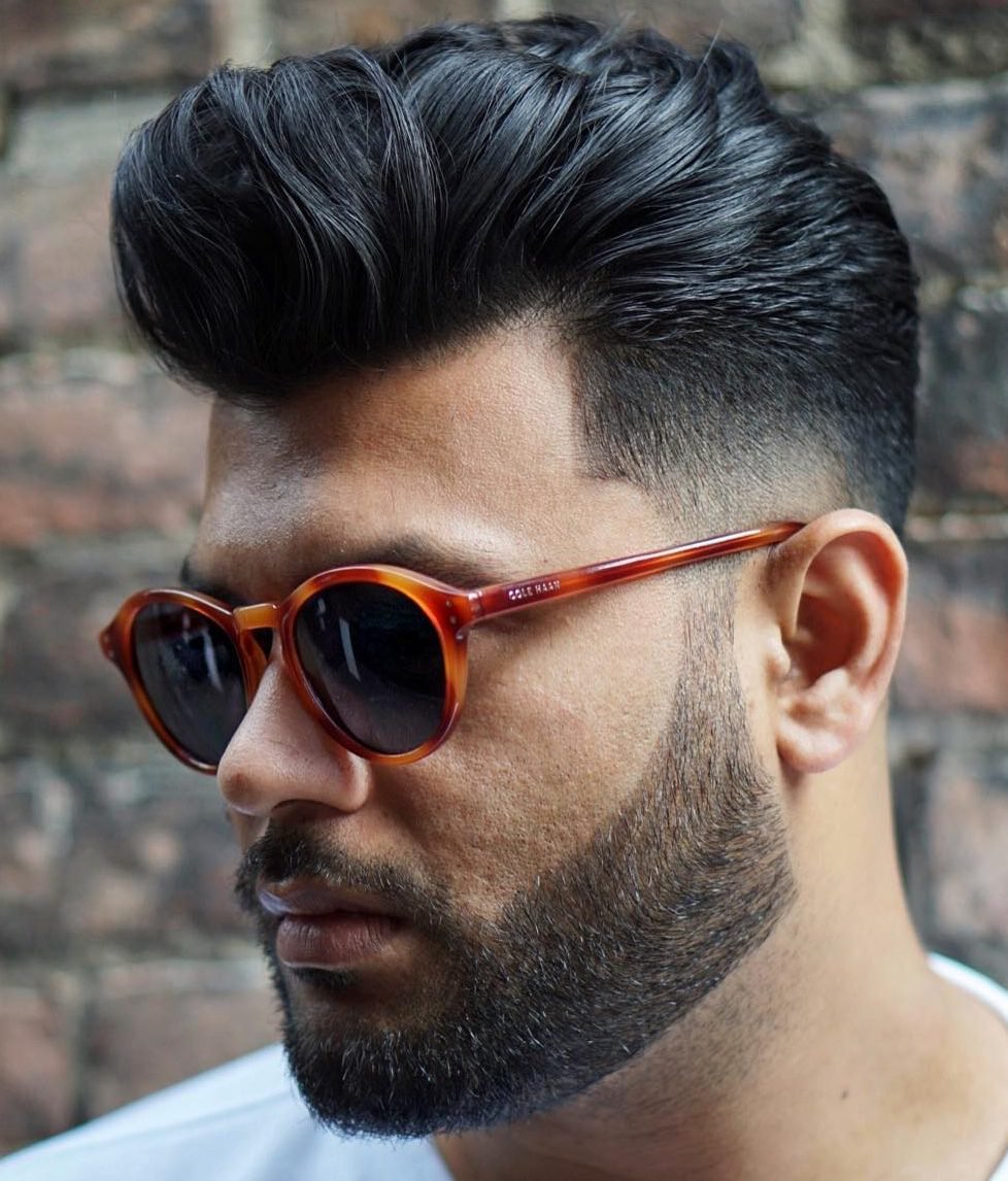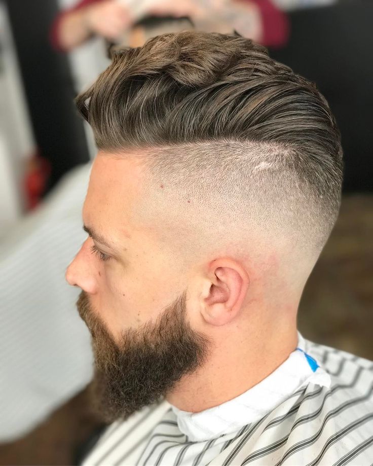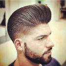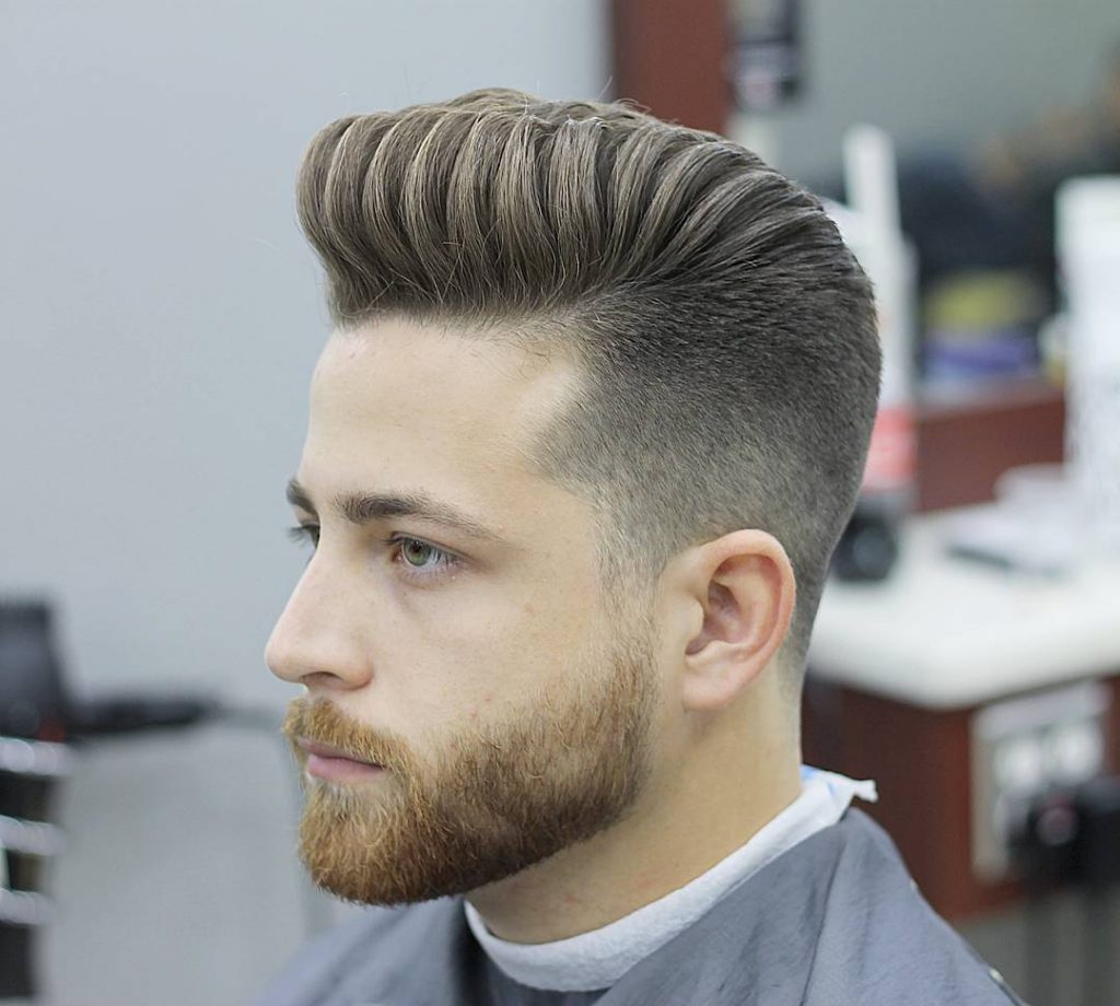 - Soluk bir pompadour saç kesiminin sakal ve bıyıkla kombinasyonu.