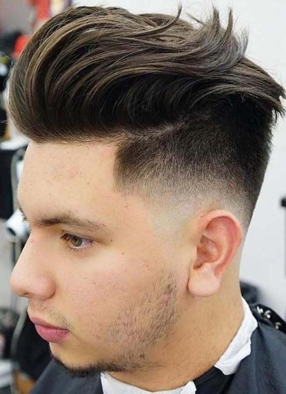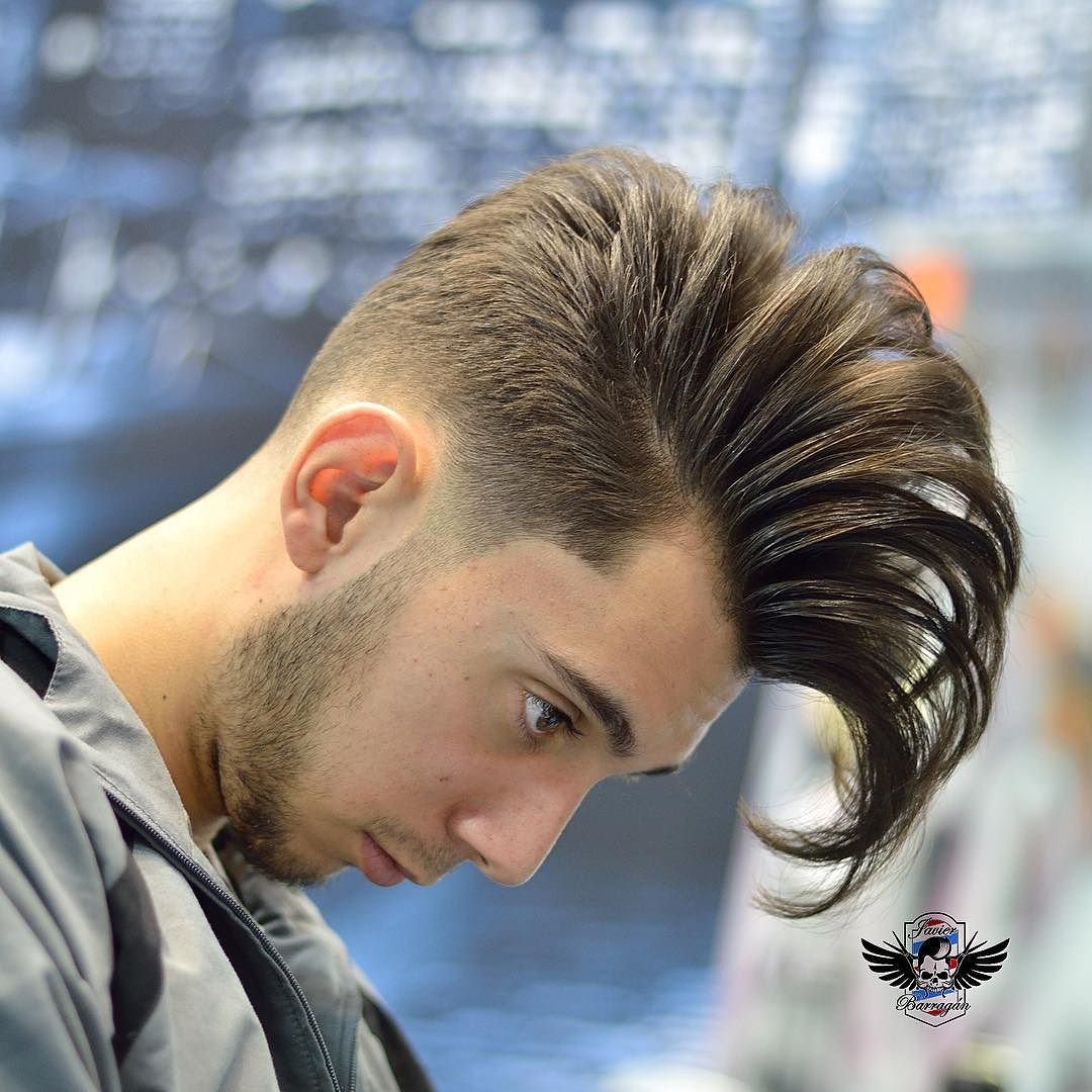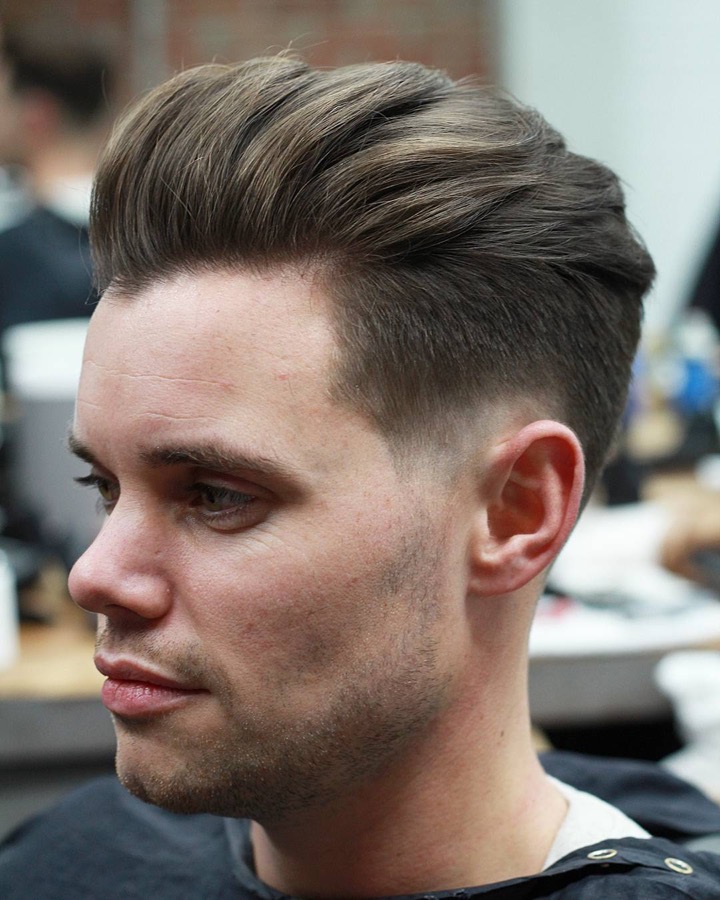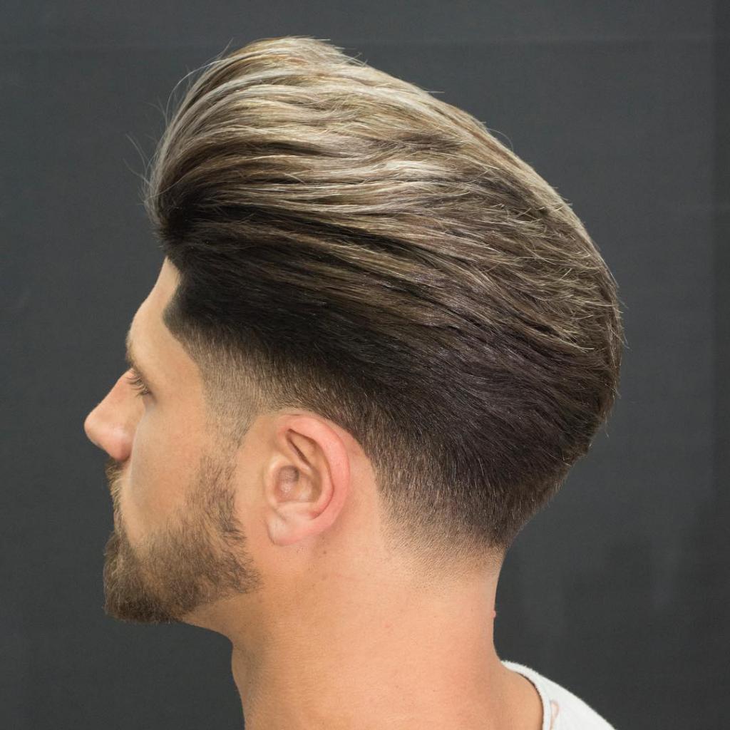 - Pompadour ve alttan kesilmiş saç kesimi kombinasyonu. Bu versiyonda, şakaklar ve başın arkası traş edilir (alttan kesilmiş bir saç kesimi elemanı) ve taçtaki uzun saçlar yükseğe kaldırılır ve şekillendirici ürünler yardımıyla gerekli hacim sabitlenir.