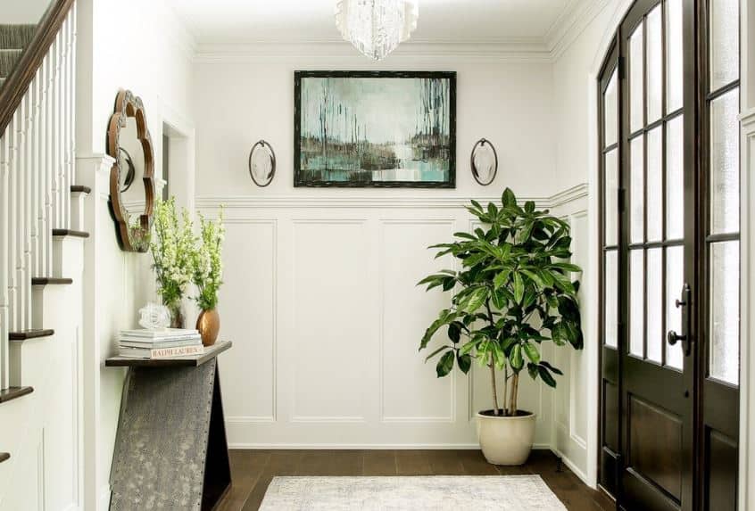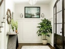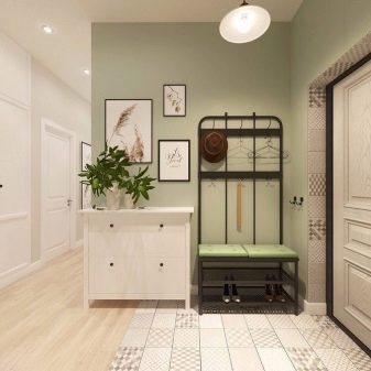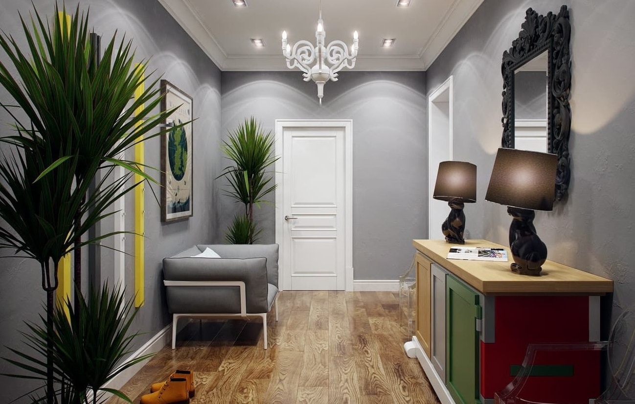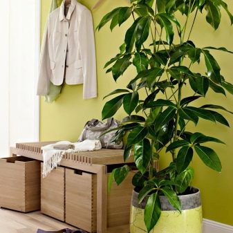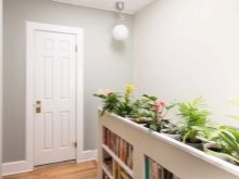 Saksı avuç içi, koridorun boşluğuna organik olarak sığabilirsakin, sessiz tonların kullanımı ile karakterize edilen İskandinav tarzında yapılmış. Aydınlatma için bitkilerin ihtiyacı yapay ışık kaynakları - bir avize, gömme tavan lambaları, masa lambaları ile telafi edilir. Uzun saksı bitkilerinin kullanılmasının, rahatsızlık yaratmayacakları geniş koridorlar için tavsiye edildiğini belirtmekte fayda var (ve bu sunulan örnekte görülebilir).