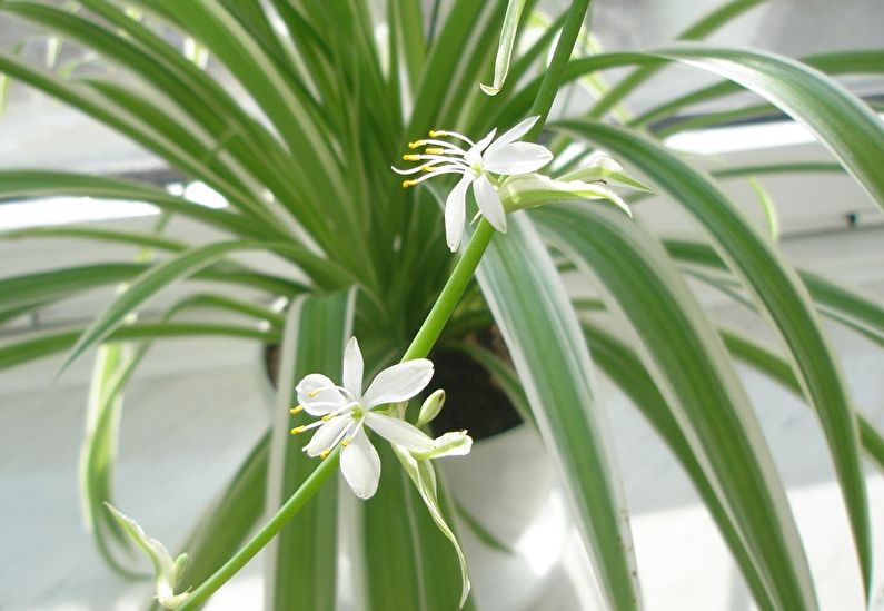 - klorofit - aşırı ışık eksikliği koşullarında, penceresiz odalarda bile aktif olarak gelişebilen ve çiçek açabilen kuraklığa dayanıklı bir iç mekan bitkisi. Chlorophytum yaprakları uzun, sarkık, bazal bir rozet içinde birleşmiştir. Çiçekler küçük, beyaz, ajur salkımlarında toplanmıştır.