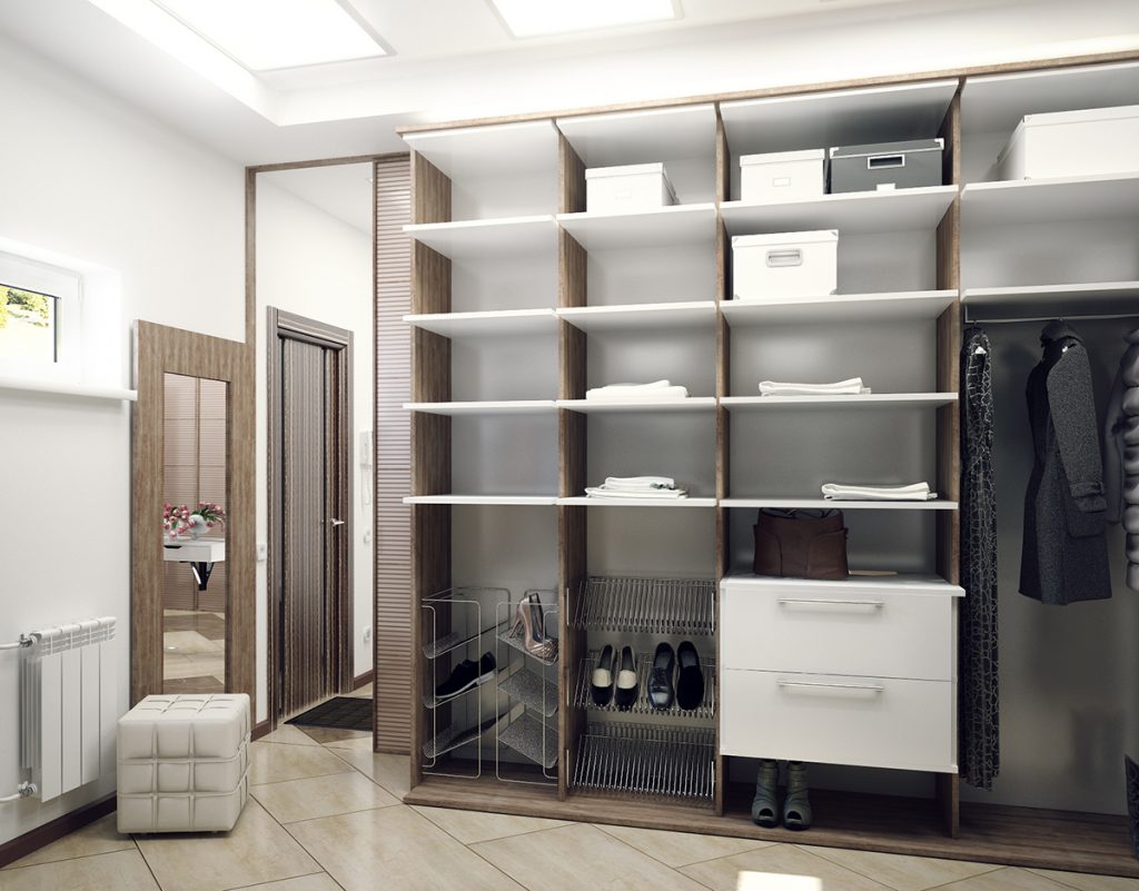 Doğrusal düzenleme. Eşyaları saklamanın çeşitli yollarını düşünmek için en iyi seçenek: raflar, çekmeceler, askılar vb.