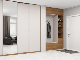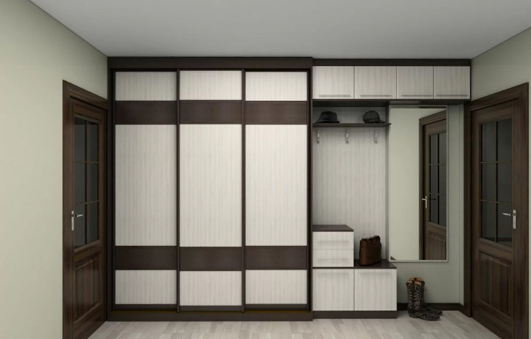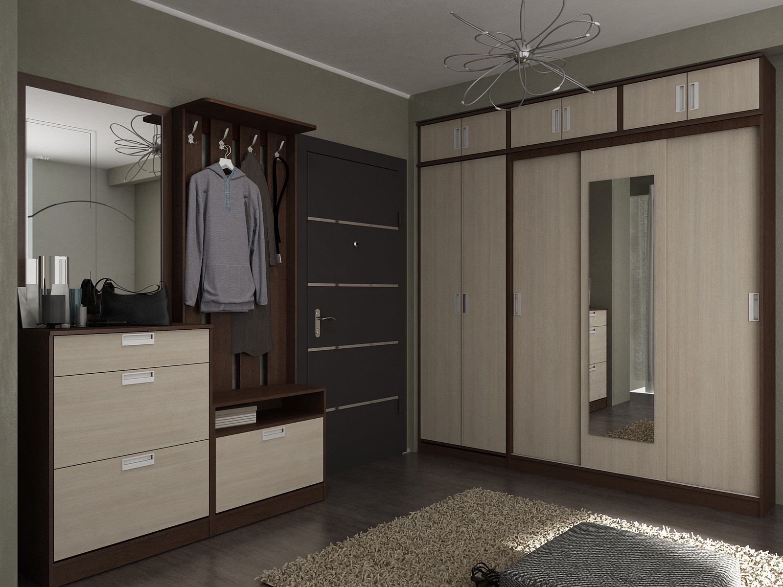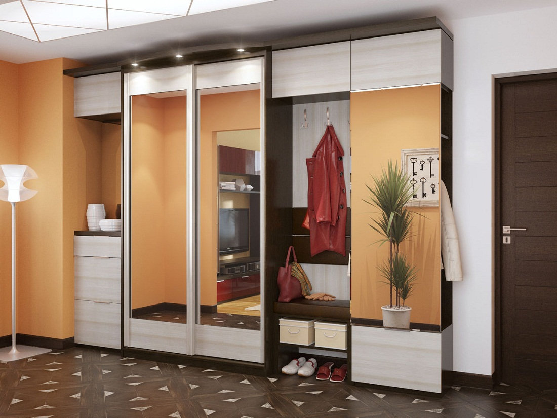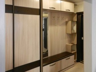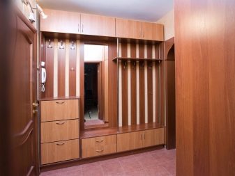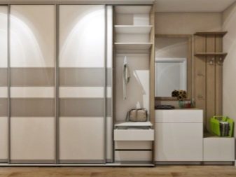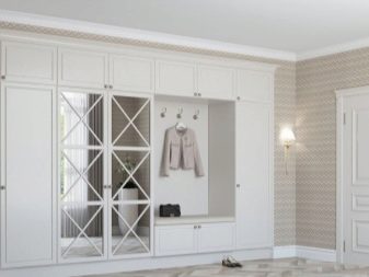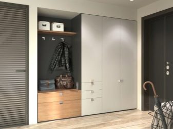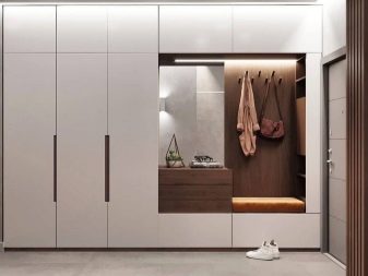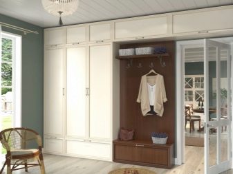 Yerleşik koridorun işlevsel yapısı, içeriğini büyük ölçüde belirler. Çoğu durumda, özel bir şey seçmek bile gerekli değildir - bu bölgede zaten depolananlara bakmak ve aynı şeylerin bileşimine odaklanmak yeterlidir. Çoğu durumda, dış giyim orada saklanır ve kıyafetleri değiştirmek için küçük bir alan bırakılır. Ek olarak, sağlanabilir: