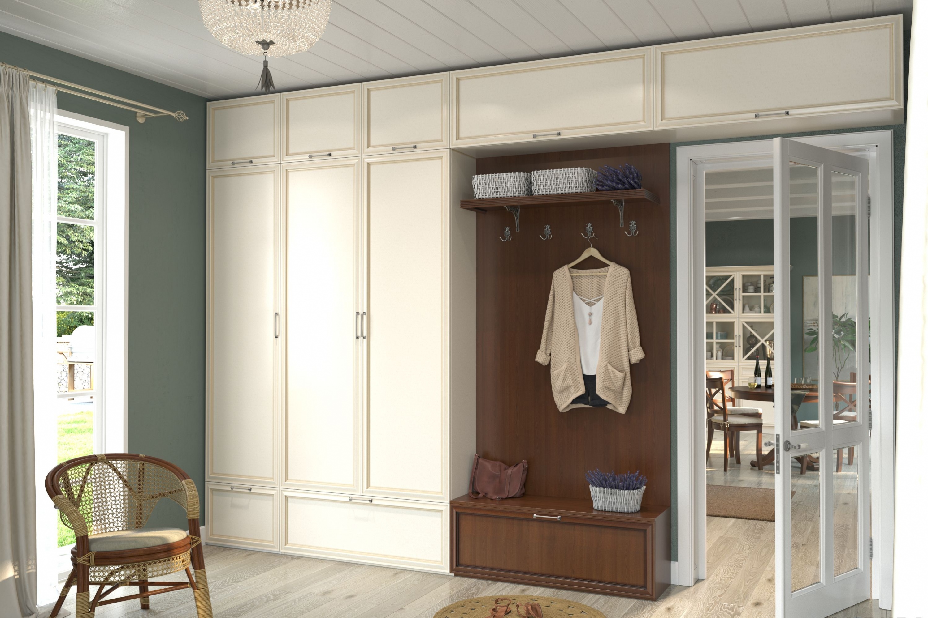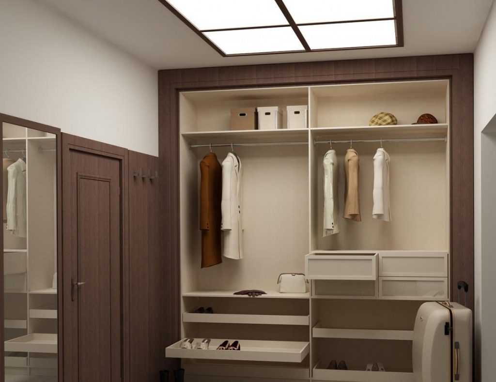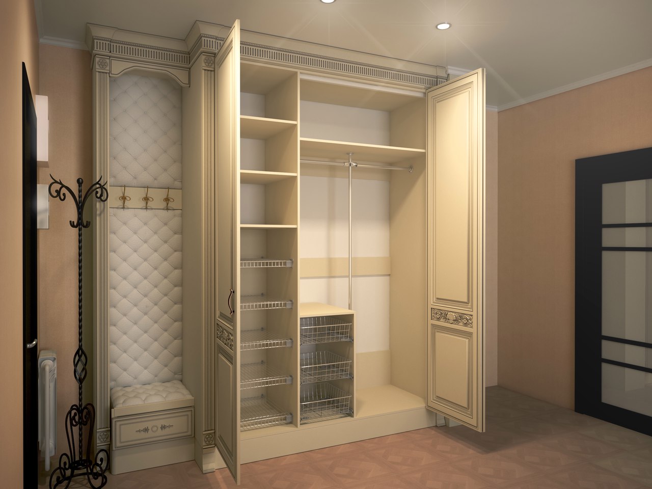 Yerleşik koridorun işlevsel yapısı, içeriğini büyük ölçüde belirler. Çoğu durumda, özel bir şey seçmek bile gerekli değildir - bu bölgede zaten depolananlara bakmak ve aynı şeylerin bileşimine odaklanmak yeterlidir. Çoğu durumda, dış giyim orada saklanır ve kıyafetleri değiştirmek için küçük bir alan bırakılır. Ek olarak, sağlanabilir:
