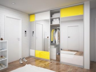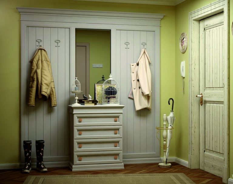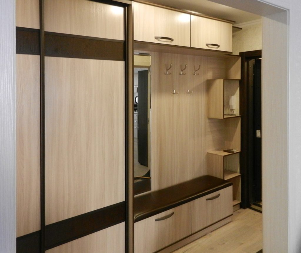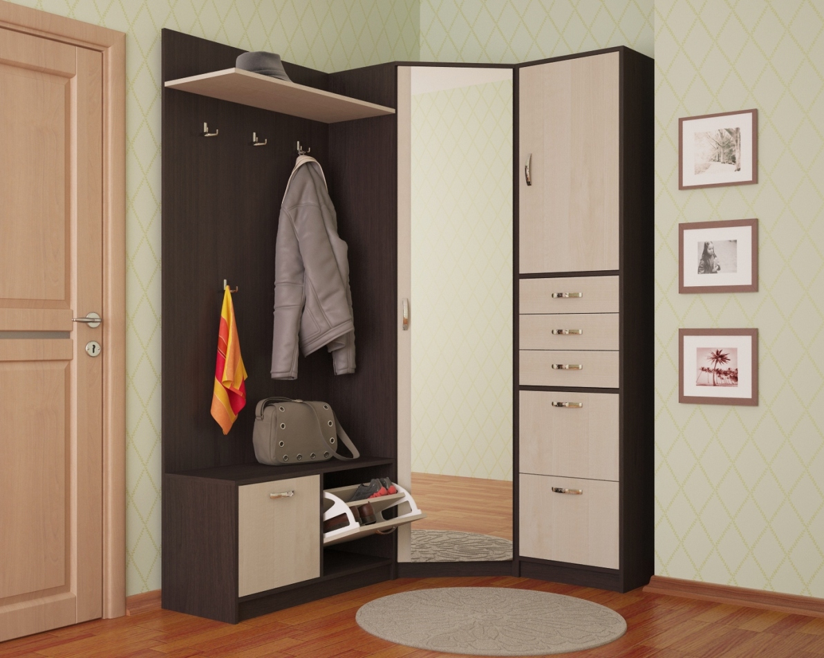 Oluşturulan kompozisyona çekmeceli bir şifoniyer güvenle eklenebilir. Büyük bir duvar aynası, yatar koltuklu bir puf ve küçük şeyler için askıya alınmış bir raf yardımıyla temelinde bir mini kulaklık geliştirmek mümkündür. Ayakkabı rafını unutmamalıyız. Aynı anda koltuk olarak kullanıldığında oldukça mantıklı ve kullanışlıdır (ve yerden tasarruf edilir). Bir doku seçerken, kesinlikle basit odunsu desenler tercih edilmelidir.