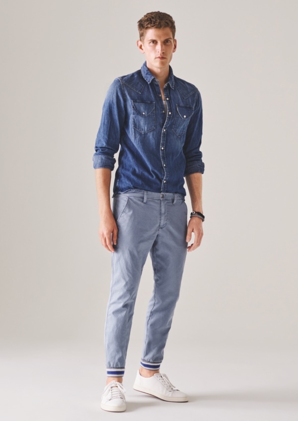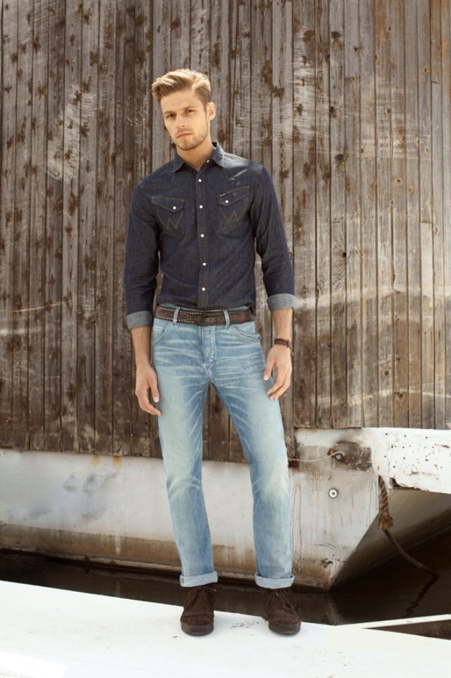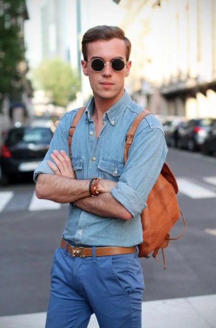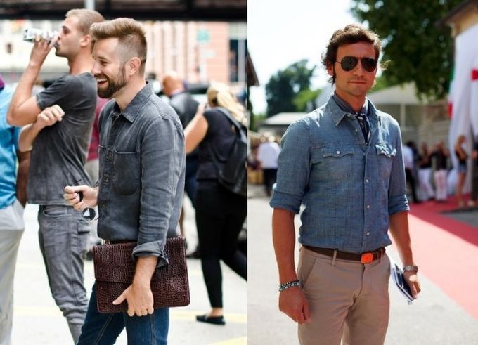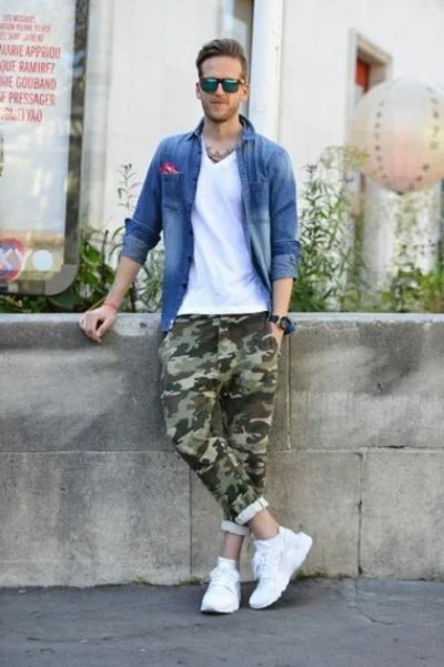 Dış giyim olarak bir kot gömlek kullanmak istiyorsanız, o zaman onun için beyaz, siyah, gri bir tişört seçmekten çekinmeyin. Bu gömlek, beyaz bir tişört ve beyaz spor ayakkabı ile manşetleri (kamuflaj dahil) olan chinolarla iyi görünüyor.