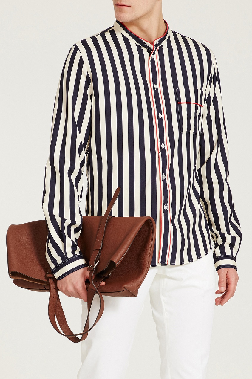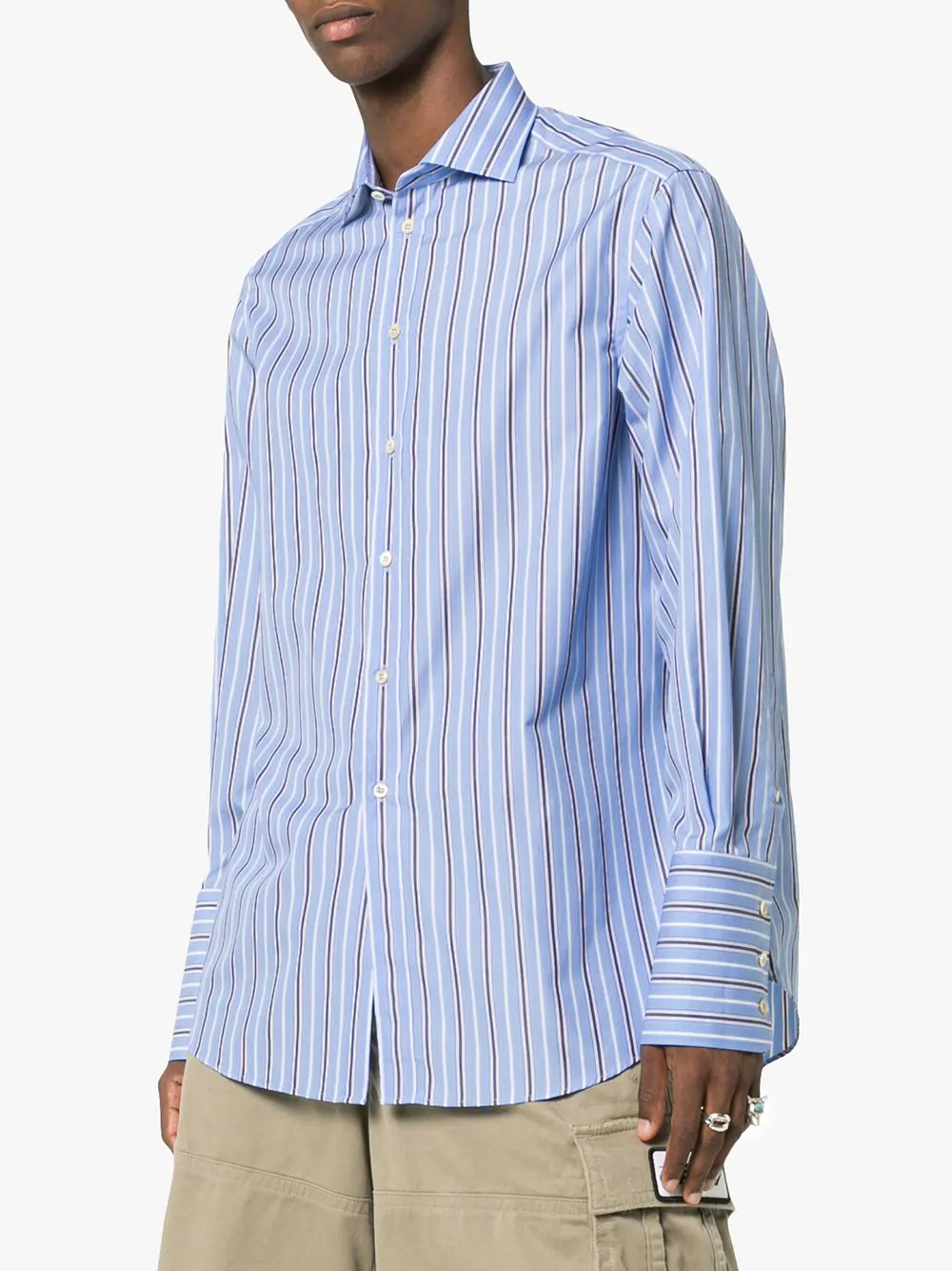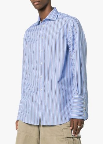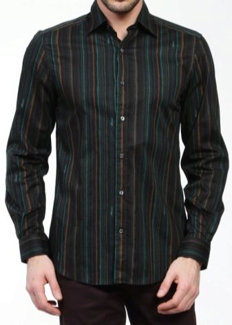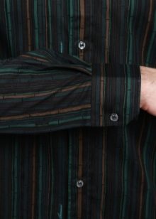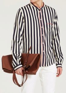 - Çizgili dökümlü gömlek. Bu model beyaz, kahverengi ve mavi çizgili baskıya, düğme manşetlere, uzun kollu ve bol kesime sahiptir.