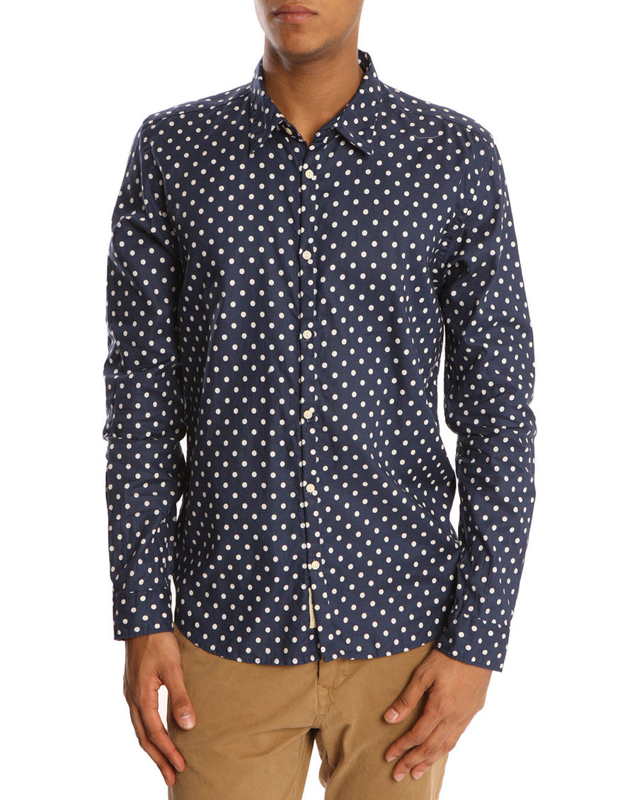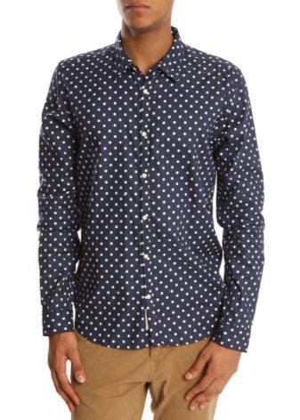 - Filkoupe kumaştan puantiyeli gömlek. Filkupe pamuklu kumaştan dikilmiş oldukça orijinal bir modeldir. Erkekler için tipik olmayan puantiyeli bir baskının yanı sıra uzun kollu, yuvarlak kenarlı ve sivri yakalı.