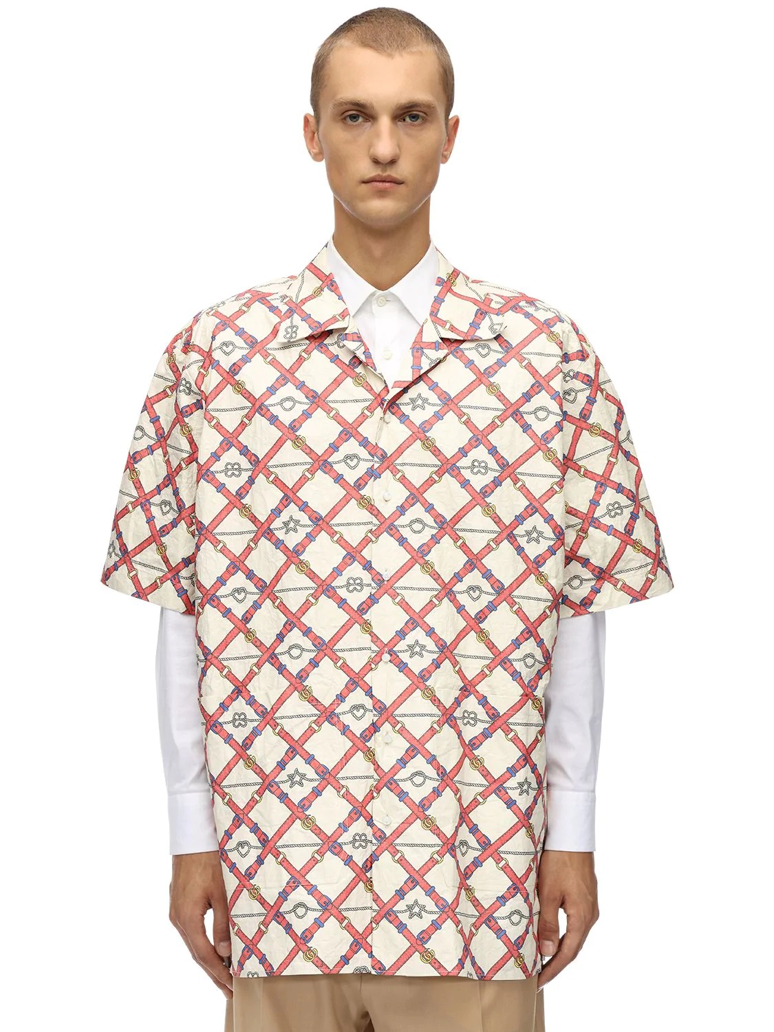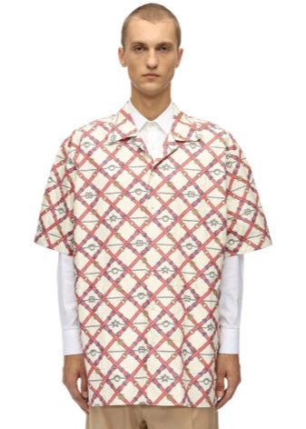 - Yıldız desenli fil-coupe gömlek. Marka logolu ve yıldız baskılı beyaz pamuklu bir gömlek.