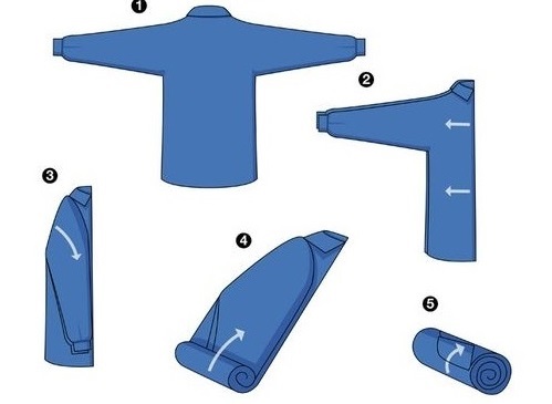 - Rulman - gömlek ortada bir kırışık ile ikiye katlanır, kollar geleneksel versiyonda olduğu gibi dikişe paralel olarak arkaya yerleştirilir.Etek ucundan başlayarak rulo halinde yuvarlanır, kompakttır, fazla yer kaplamaz.