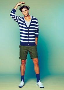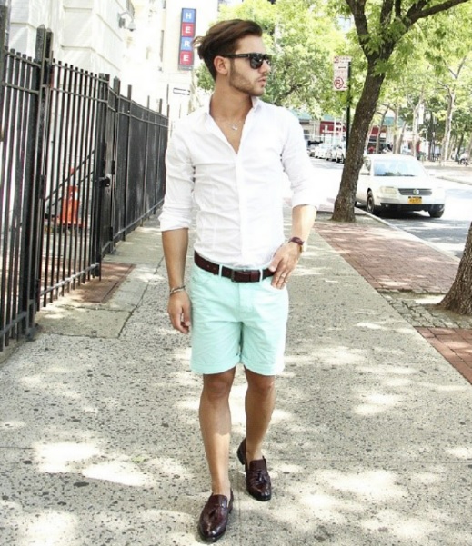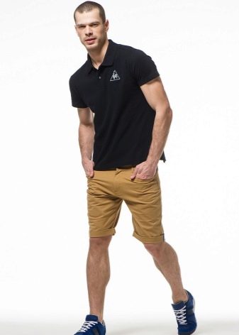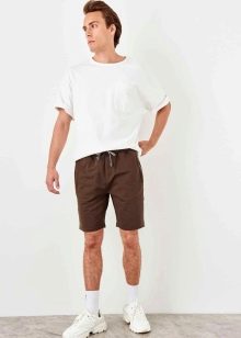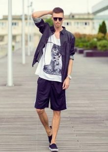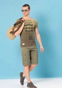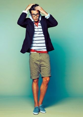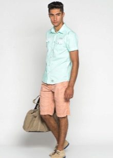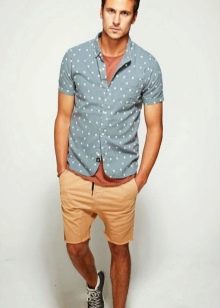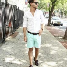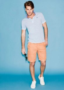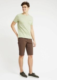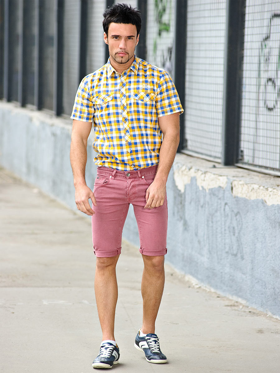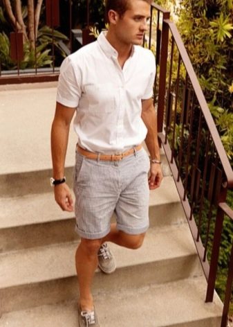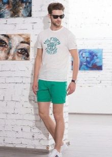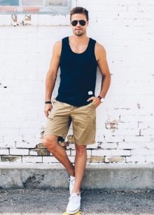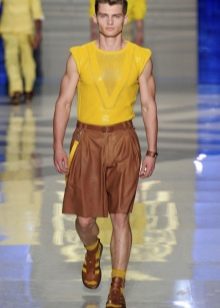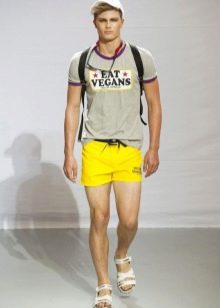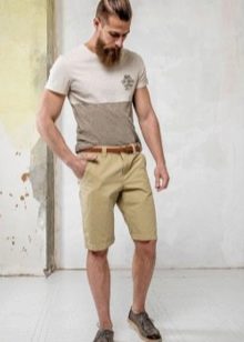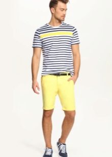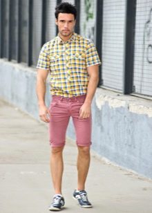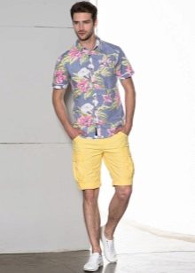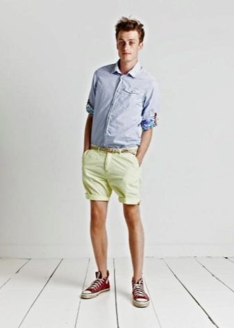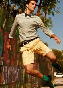 - Oldukça sağlam bir üst ile eşleştirilebilen hardal şort. Parlak ayakkabılar bu görünümde şaşırtıcı derecede uygun çıktı. Fazla kilosu olmayan genç erkekler için uygundur.