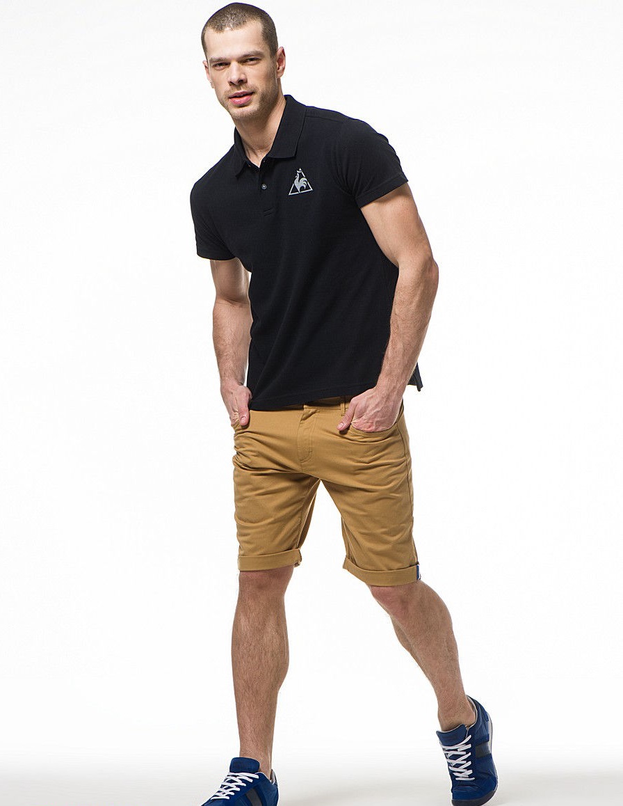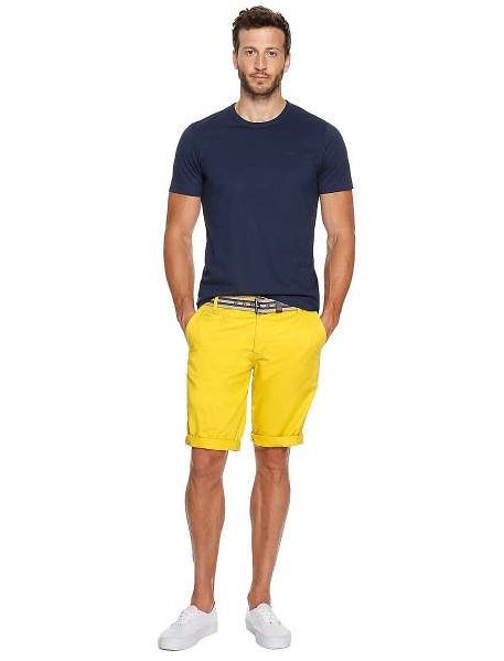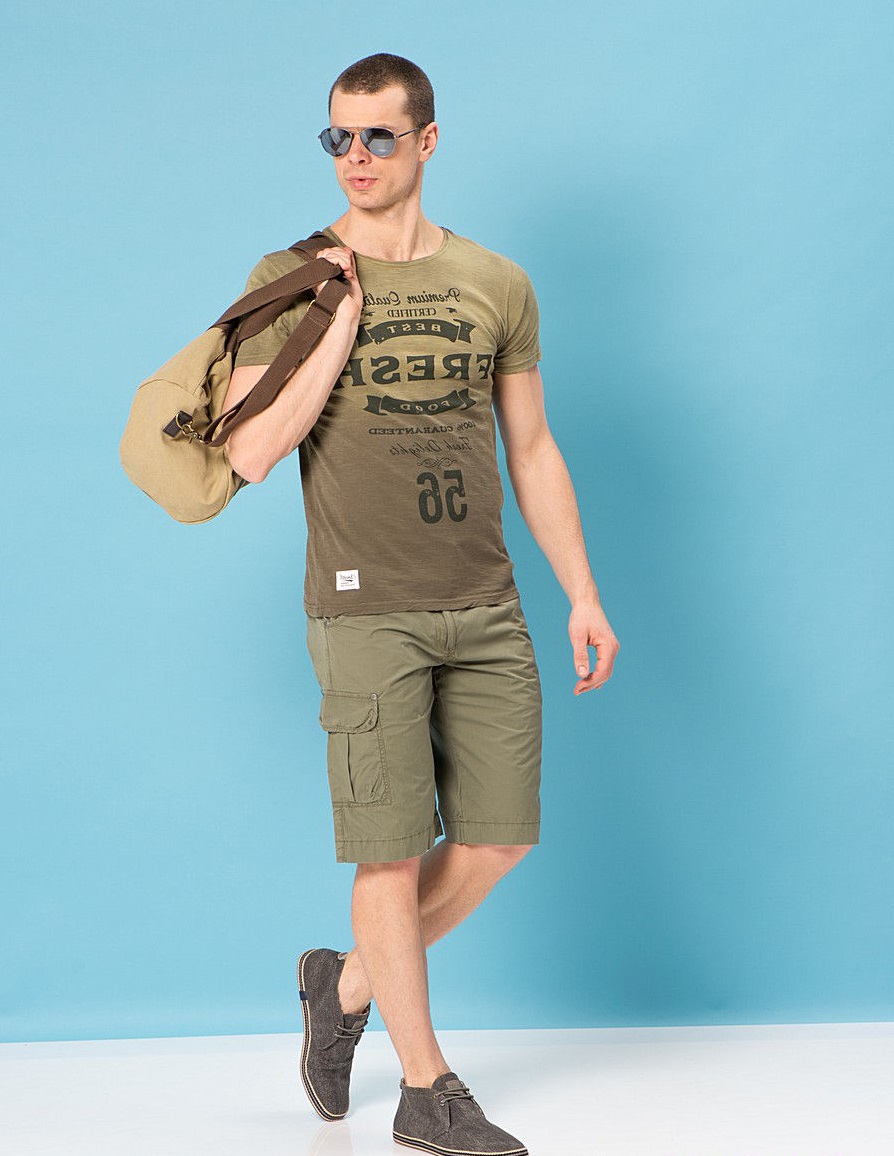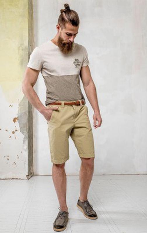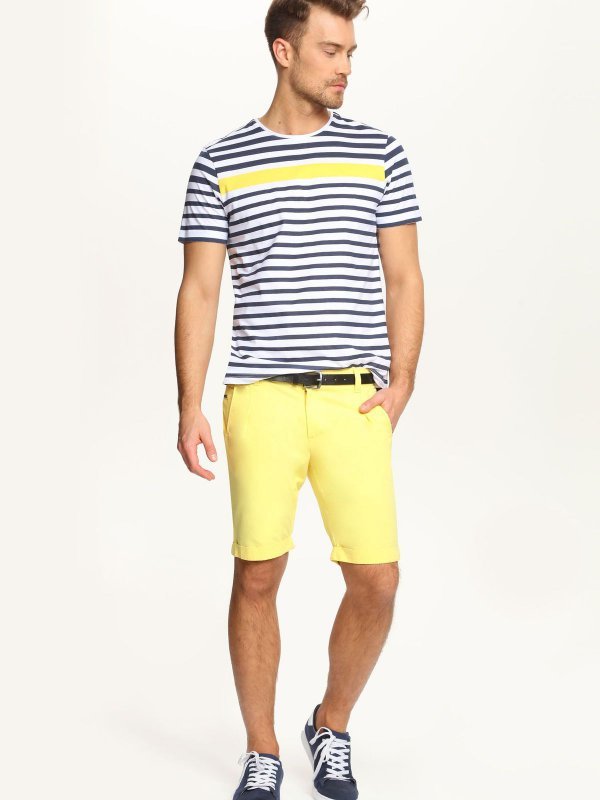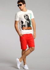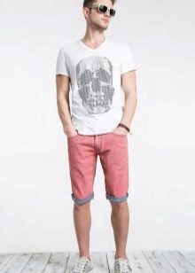 - Oldukça sağlam bir üst ile eşleştirilebilen hardal şort. Parlak ayakkabılar bu görünümde şaşırtıcı derecede uygun çıktı. Fazla kilosu olmayan genç erkekler için uygundur.