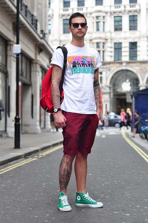 - Bordo şortlar ve yeşil spor ayakkabılar cesur, eğlenceli ve oldukça acımasız. Donuk yaz görünümlerinden sıkıldıysanız, bu örneklere bakın. Hafif bir gömlek yerine daha parlak bir şey seçerseniz kaybedersiniz.