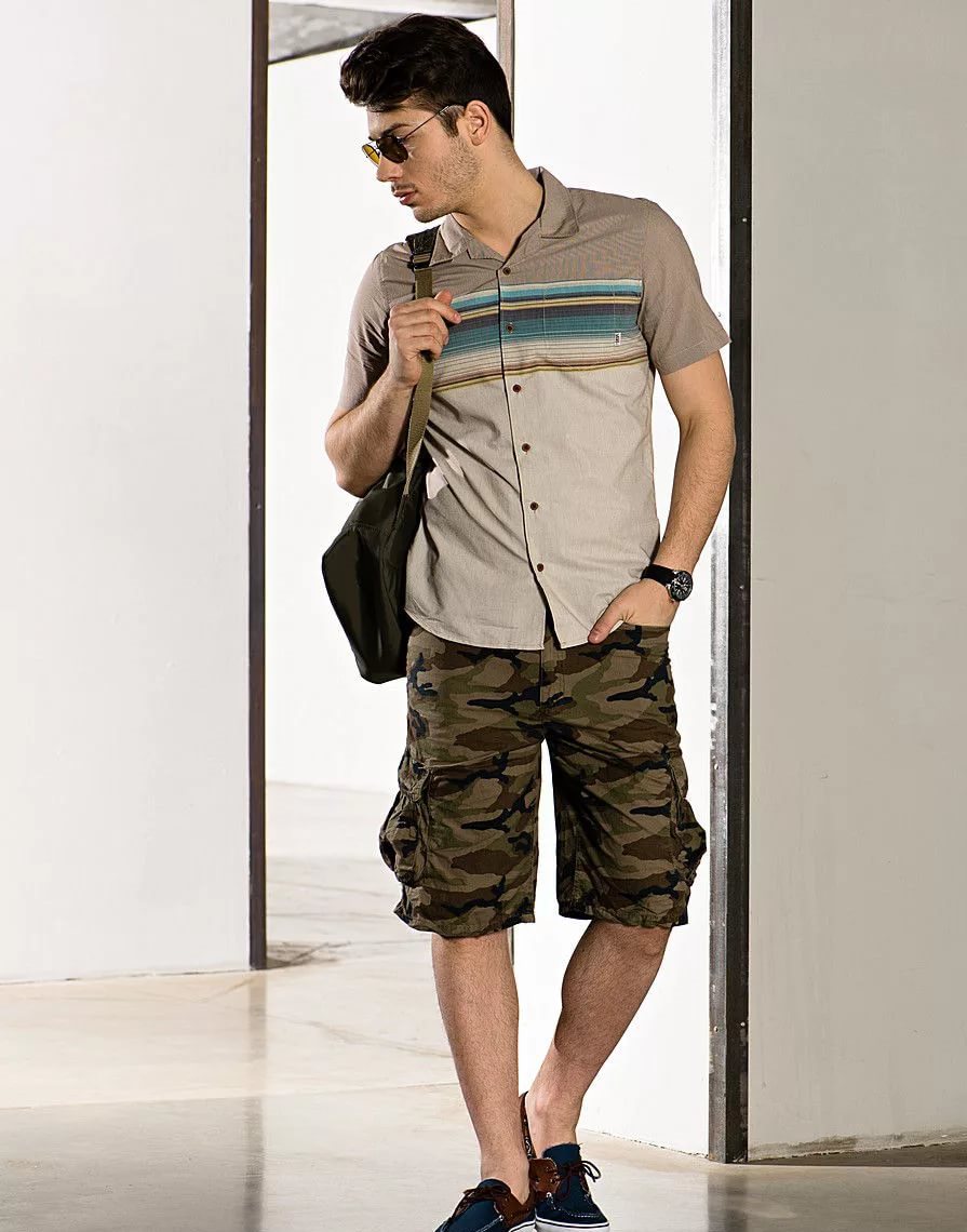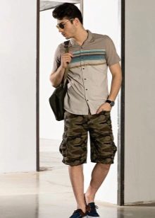 - Askeri. Bu tarzdaki modeller asla modası geçmeyecek. Kalın haki renkli kumaştan yapılmıştır. Askeri tarz şortlar "sokak şıklığı" olarak tanımlanabilir. Yama cepli kamuflaj modelleri (kargo), her erkek görünümüne vahşet ve karizma katacak.