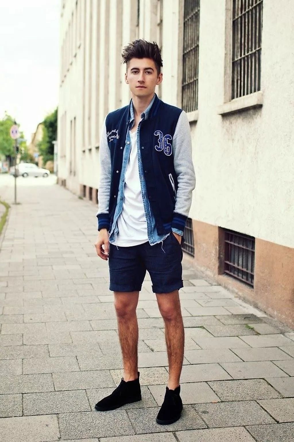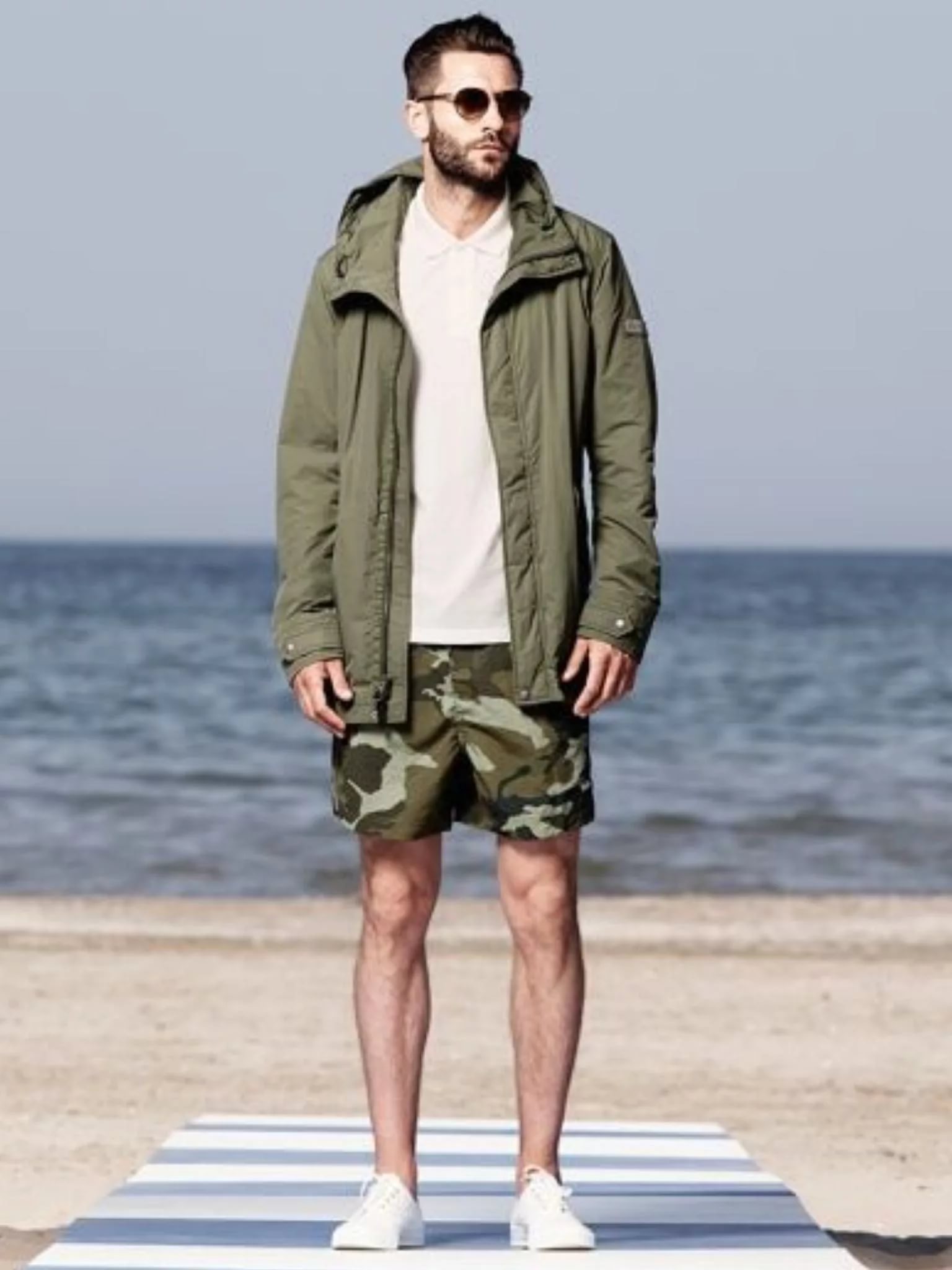 Askeri tarz şortlar, kot ceketler ve spor ayakkabılarla iyi gider.