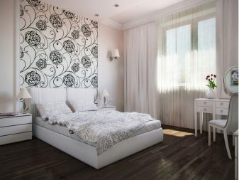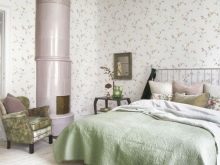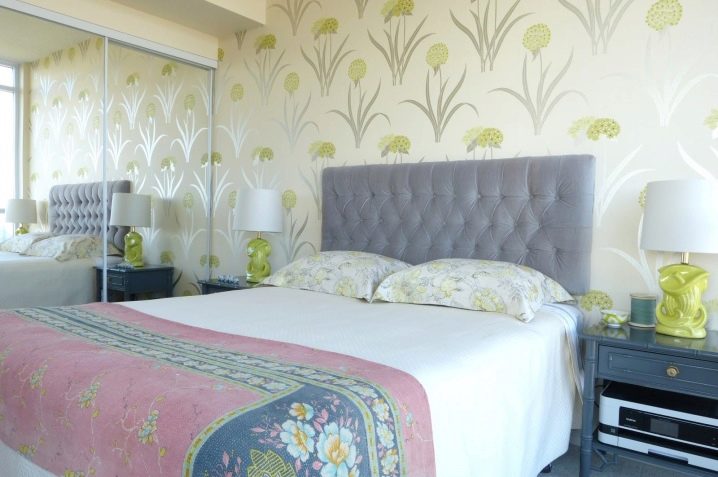 - Çiçek baskılar uzun zamandır son derece popüler olmuştur., bu nedenle, büyüleyici çiçek ve dal görüntüsüne sahip duvar kağıdı, yatak odası dekorasyonu için çok sık satın alınır. Bu nedenle, insanlara maksimum rahatlama ve rahatlama verilen bir odada, sarımsı ve soluk yeşil tonlarında eskitilmiş sevimli karahindibaları betimleyen sütlü veya bej tuvaller harika görünecek. Böyle sakin ve hoş bir bitişin arka planına karşı, kadife kumaşla kaplanmış yüksek grimsi bir başlıklı, taşıma kravatlı rahat bir yatak koyabilirsiniz. Duvarlarda çok sayıda ayna veya aynalı kapılı bir gardırop iyi görünecek.
