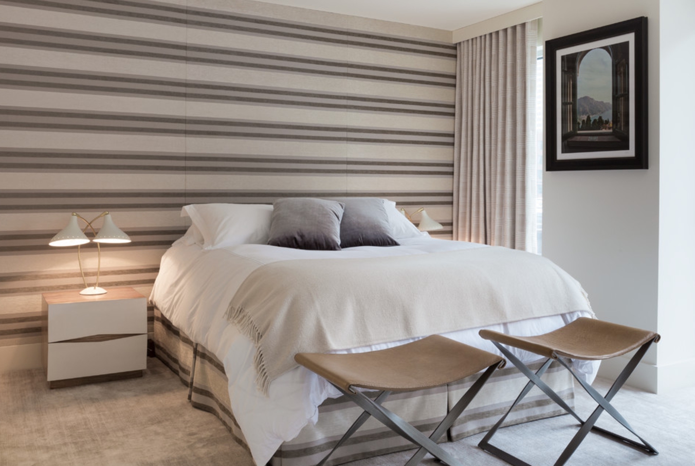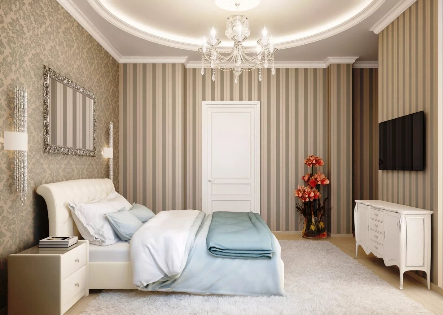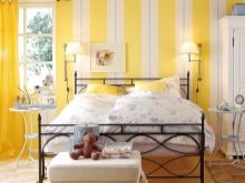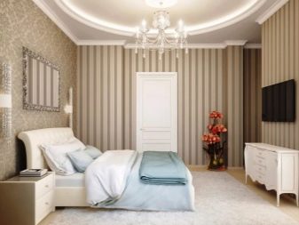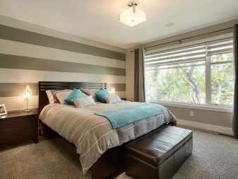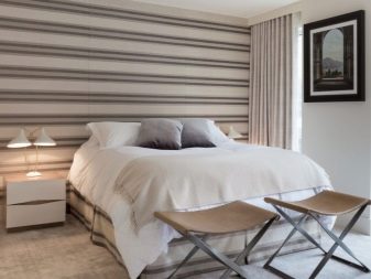- Çizgili duvar kağıdı. Bu kaplama malzemeleri de uzun zamandır çok popüler olmuştur. Bu güne kadar, özellikle alçak tavanlı bir yatak odasının dekorasyonu söz konusu olduğunda talep görüyorlar. Duvarlara dikey çizgili tuvaller yapıştırılırsa, odanın yüksekliği görsel olarak artacaktır. Benzer bir etki, odayı görsel olarak daha uzun yapan yatay çizgilerle elde edilebilir. Bugün mağazalarda bir yatak odası için mükemmel olan birçok birinci sınıf tuval var.