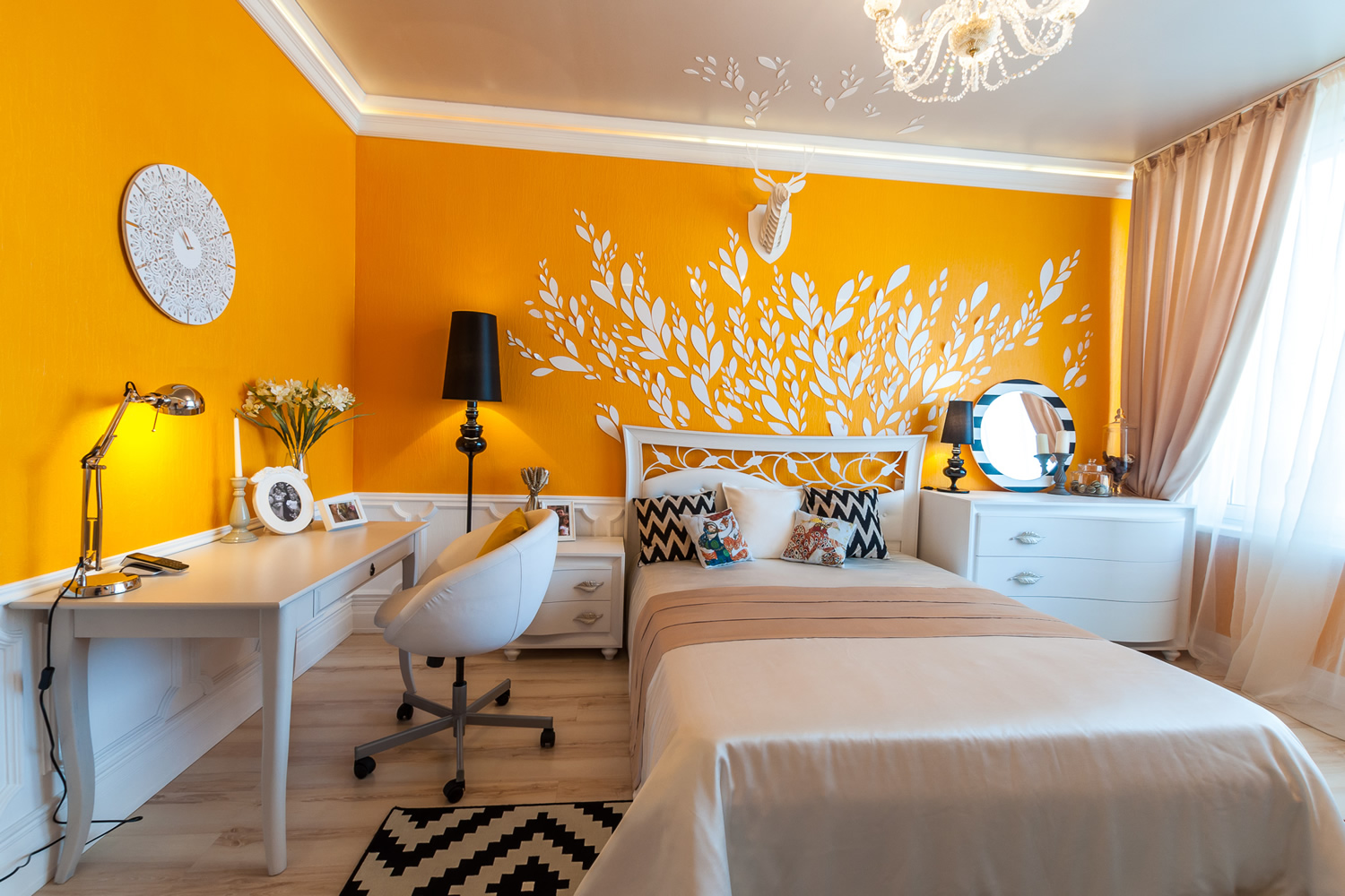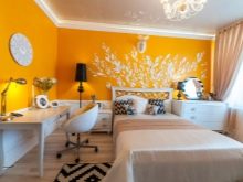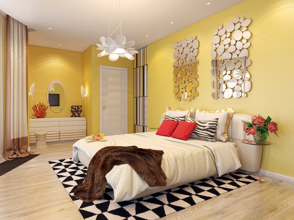 - Sarı. Sıcak bir başka moda renk. Onun yardımıyla, havayı yükselten pozitif ve güneşli bir alan yaratmak mümkündür. Sarı, enerjinin, hayal gücünün uyanmasına katkıda bulunur. Yatak odanızı modaya uygun, parlak ve olumlu bir şekilde dekore etmek istiyorsanız bu harika bir çözüm.