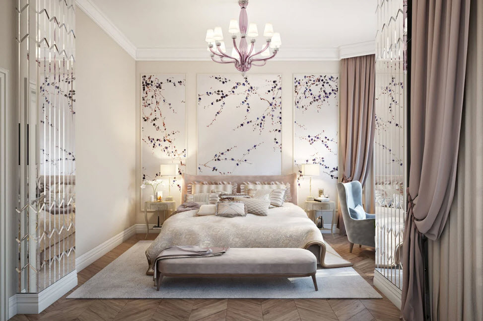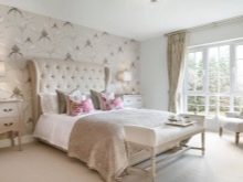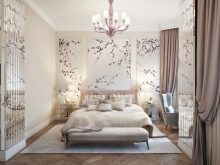 - Yatak odası çok rahat ve misafirperver görünecek, dekorasyonu için hafif duvar kağıtları seçilmiş, oryantal bir temada zengin görüntüler sergiliyor. Bunlar, hafif bir parlaklığa sahip güzel tuvaller veya oryantal motiflerin arka planına karşı gizli bir gradyan etkisi olabilir. Böyle ilginç bir kaplama ile birlikte, bej deri döşemeli rahat bir çift kişilik yatak ve başlıkta bir taşıma bağı ile dekore edilmiş uyumlu bir şekilde görünecek. Böyle bir iç mekanda komodinler yerine yüksek ayaklı zarif masalar kullanabilirsiniz. Tavanı ve zemini bitirmek için en iyi renkler beyaz veya sütlüdür.