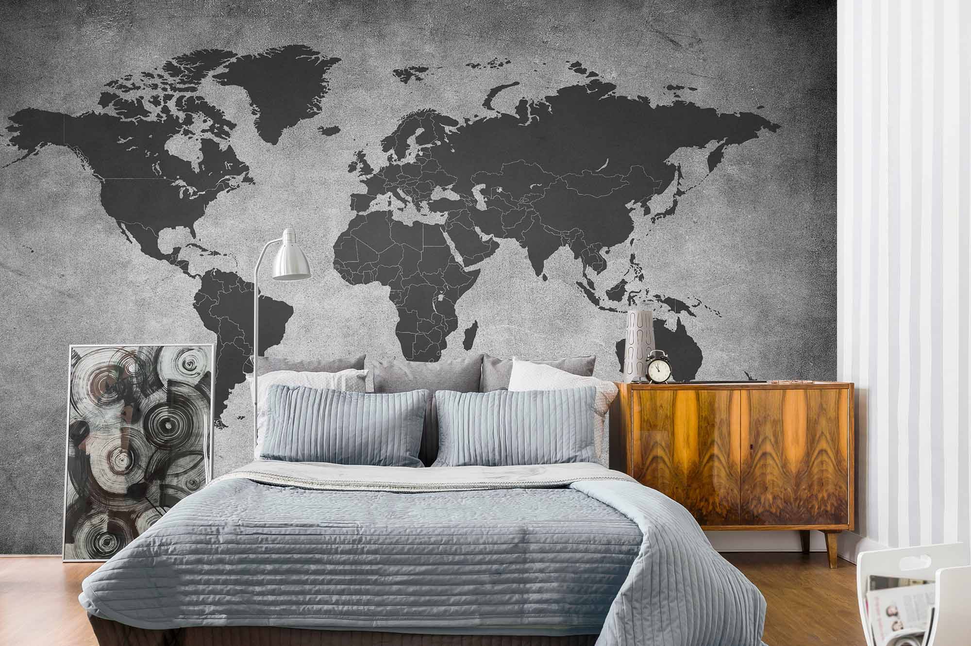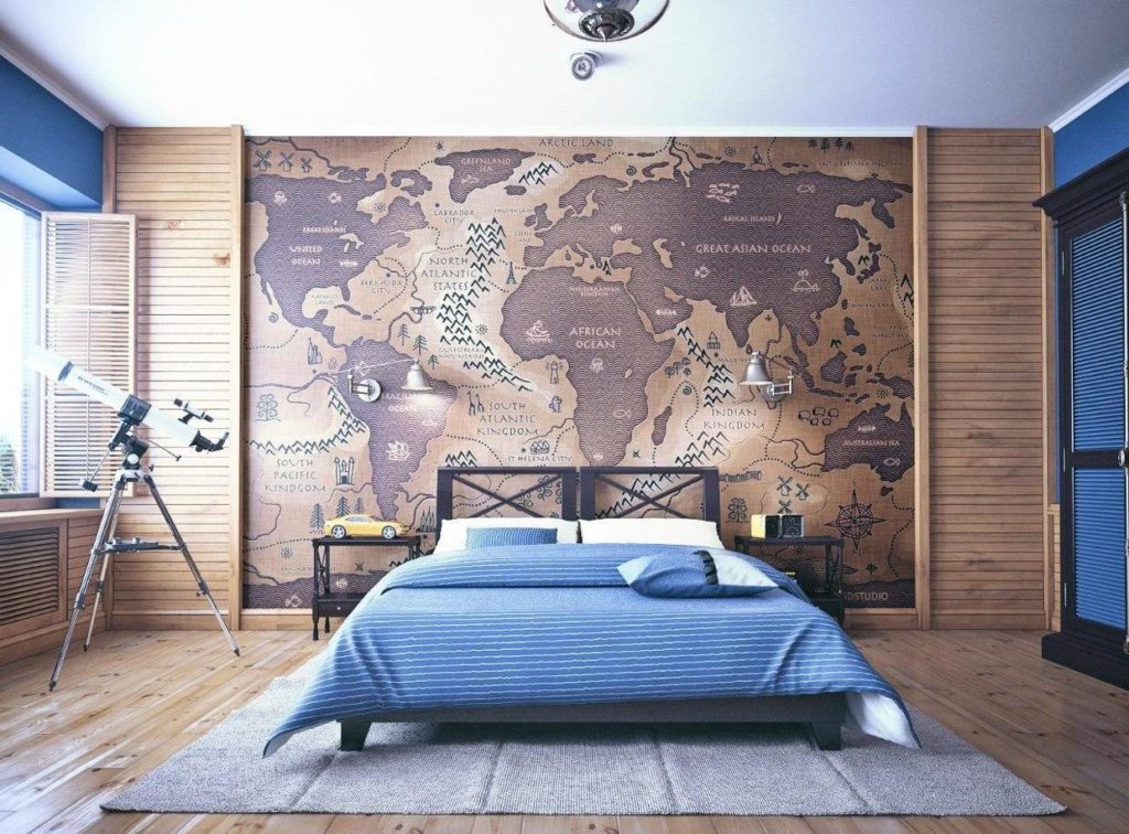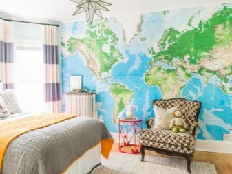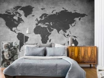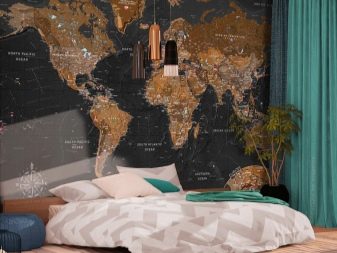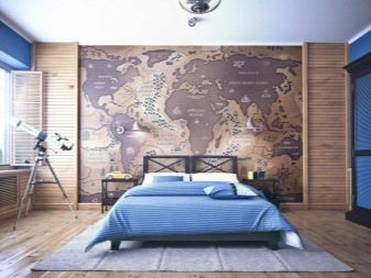 - Coğrafi Haritalar. Şık ve çekici bir yatak odası tasarımı için çeşitli coğrafi haritaları gösteren duvar kağıtlarını kullanabilirsiniz. Pürüzlü kenarları olan daha bulanık haritaların tercih edilmesi önerilir. Böyle bir duvar kaplaması, iç mekanı kesinlikle yenileyecek, yaratıcı ve özgün hale getirecektir.