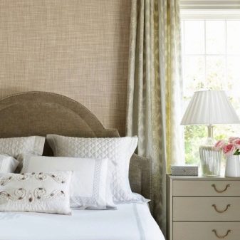 Çeşitli kumaşları taklit eden modern duvar kağıdı çeşitleri çok sıradışı görünüyor. Bu kaplama malzemeleri çok geniş bir yelpazede sunulmaktadır. Satışta düz yüzeyli, karakteristik baskılı tuvaller bulabilirsiniz. Kumaşlar için duvar kağıtları açık veya koyu olabilir. Çok küçük yatak odaları için, bu tür bir kaplama daha dikkatli seçilmelidir, çünkü görsel olarak zaten küçük bir yatak odasını daha da sıkışık hale getirebilir.