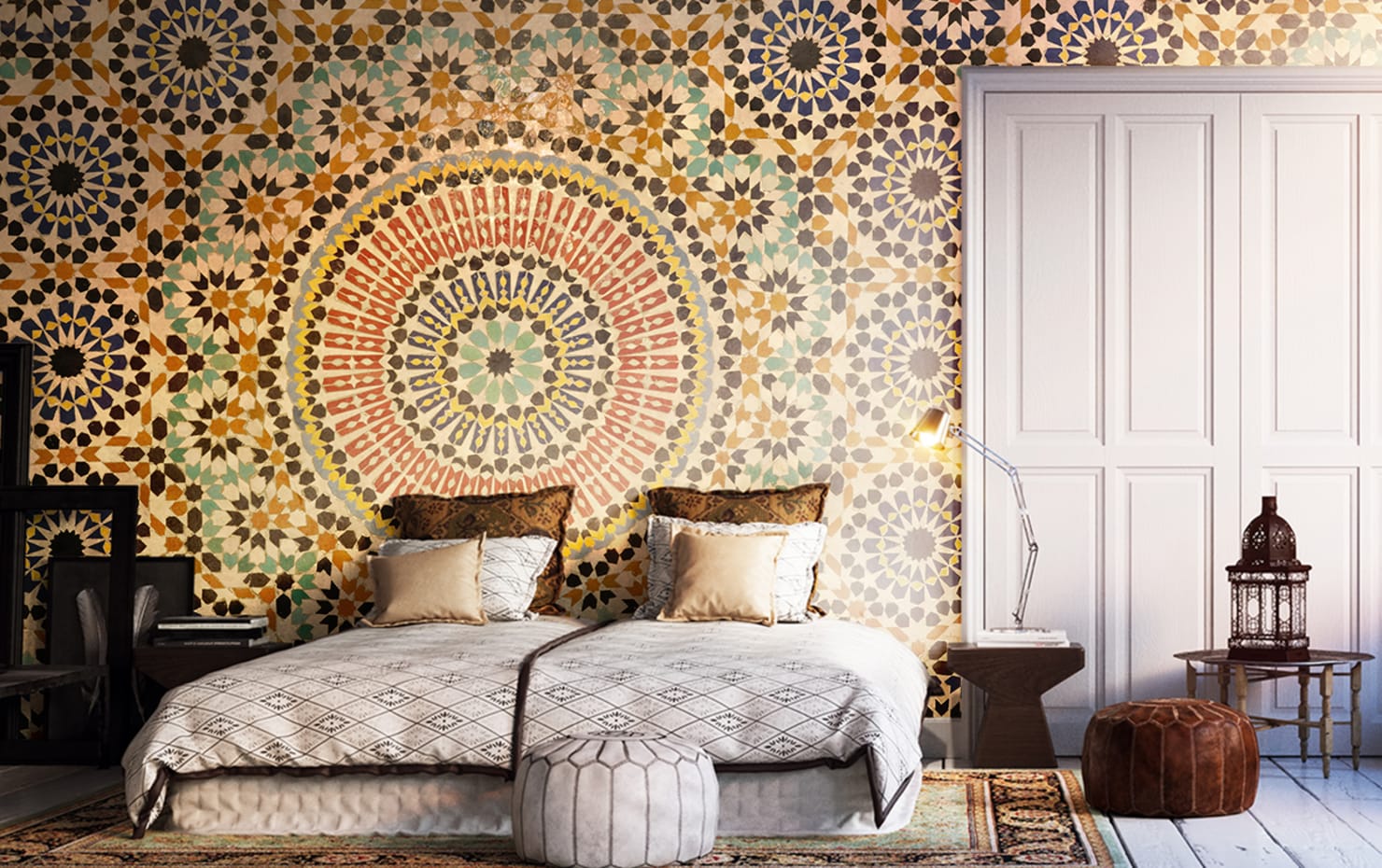 - Etnik süsler. Bugün, etnik süslemelerin ve baskıların bulunduğu duvar kağıtları trend. Böyle bir bitiş, yalnızca belirli stillerin iç mekanlarında çekici ve uyumlu görünecek.