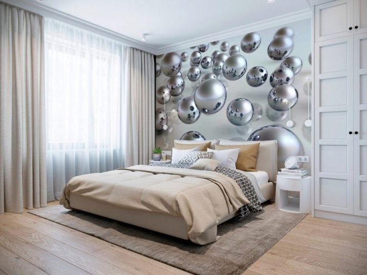 - Duvar resimleri yatak odasında havalı ve orijinal görüneceküzerinde tasvir edilen parlak toplarla açık renkli bir arka plan gösteriyor.Böyle modern ve şık bir motif, iç mekanda orijinal bir aksan rolünü mükemmel bir şekilde oynayacaktır. Açık renklerde tasarlanan duvar resimleri, yatak başlığının tam arkasında yerini bulacaktır. Beyaz bir tavan ve hafif karamel laminatla kaplanmış bir zemin, böyle bir kaplama ile çekici bir şekilde birleştirilecektir.