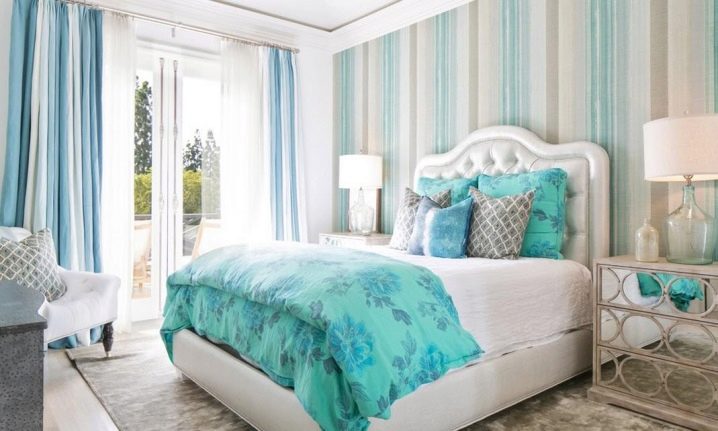 - Soluk mavi, açık yeşil ve beyaz tonlarında tasarlanmış yatak odaları çok güzel ve ferah görünüyor. Böyle bir iç mekanda, bir taşıma kuplörü ile süslenmiş kıvırcık bir başlık ile muhteşem bir kar beyazı yatağın yanı sıra mavi tonlarda nevresimler yerleştirebilirsiniz. Bu mobilya parçasının arkasında, turkuaz, bej, sütlü, mavi - farklı renklerde dikey çizgileri gösteren duvar kağıdı şeklinde bir dekorasyon olacaktır. Çizgili kaplama malzemelerinden harika bir vurgu çıkacaktır. Yatak odasındaki diğer tüm duvarlar beyaz renklerde dekore edilebilir.
