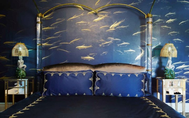 En popüler, parlak ve etkileyici, çeşitli balıkları, karidesleri, yengeçleri ve diğer amfibileri betimleyen modaya uygun tuvallerdir. Tipik olarak, listelenen "karakterler" koyu bir arka plan üzerindedir. Bu tasarıma sahip duvar kağıtları çok sıradışı görünüyor. Yatak odalarının dekorasyonu için tüm kullanıcılar bunları kullanmaya cesaret edemez.