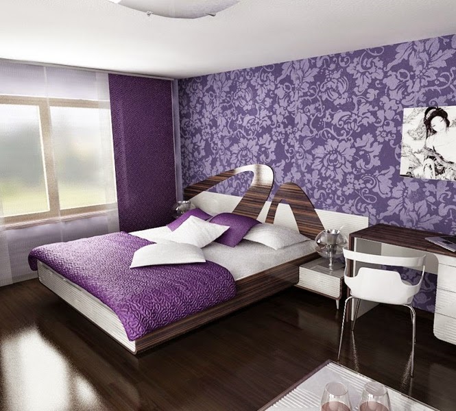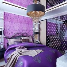- Yatak odası, zıt beyaz çizgilerle tamamlanan koyu leylak duvar kağıdı ile yapıştırılmış, sağlam ve çekici görünecek. Bu tür duvar dekorasyonunun tavanın ve zeminin beyaz rengiyle birleştirilmesi tavsiye edilir. Yumuşak leylak nevresimli beyaz bir yatak, beyaz bir tuvalet masası ve kabarık pancar renkli bir zemin halısı burada uyumlu görünecek.