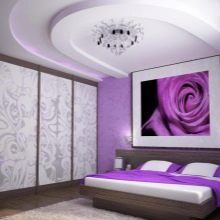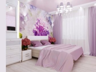 Çok özgün ve zarif bir çözüm - soluk leylak gül goncalı fotoğraf duvar kağıdı ile süslenmiş vurgulu bir duvara sahip soluk leylak duvar kağıdı ile duvar dekorasyonu. Vurgulu duvarın yanına, alçı veya alçıpan kutu ile vurgulanan, zengin leylak ve soluk renklerde sürdürülen bir yatak konulması tavsiye edilir.