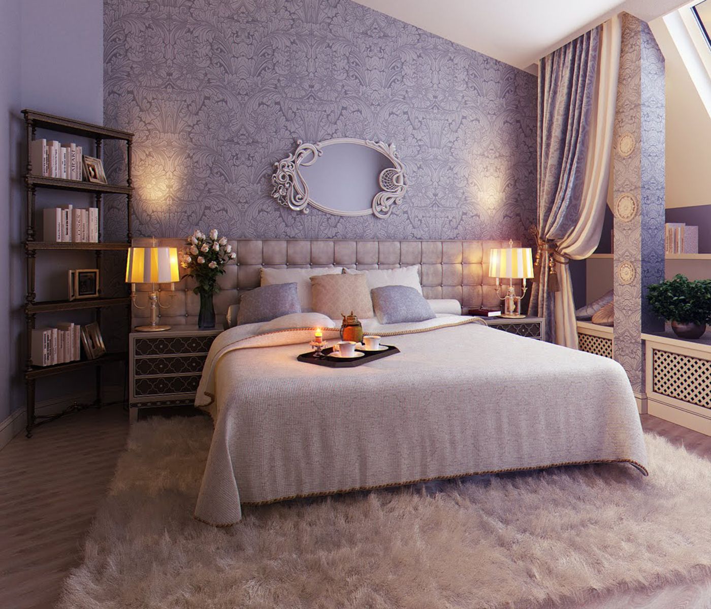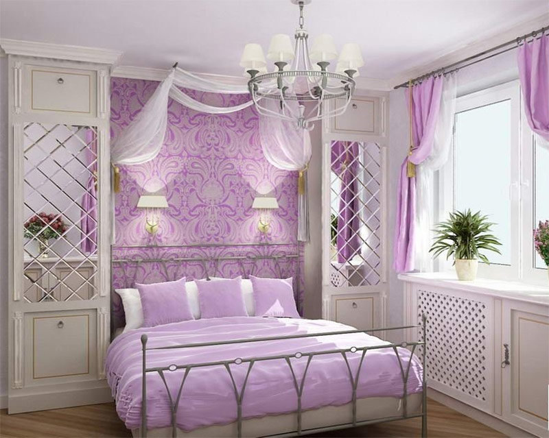 Duvarları beyaz desenli baskılı leylak duvar kağıdı ile kaplanmış bir yatak odası çok çekici ve taze görünecek. Benzer bir bitişin arka planına karşı zemin ve tavan, soluk gri ve beyaz tonlarda dekore edilmelidir.