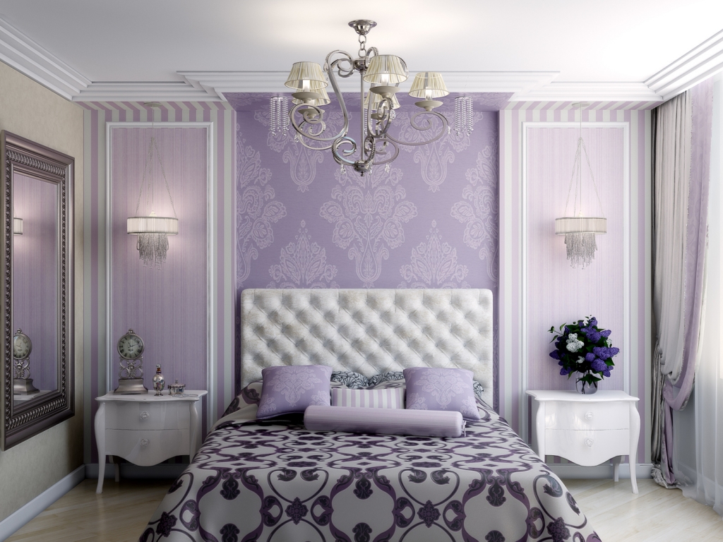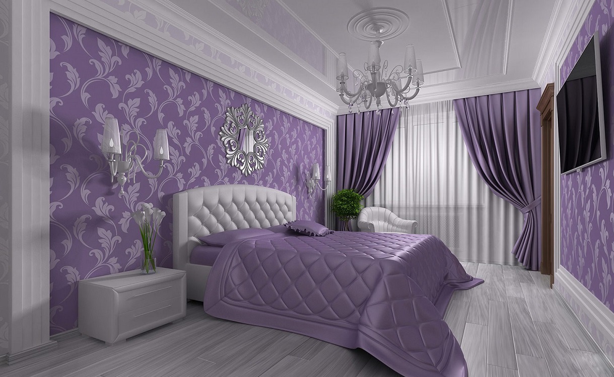 Yatak odasındaki duvarları süslemek için aşağıdaki leylak tonlarında tasarlanmış güzel bir duvar kağıdı seçebilirsiniz: