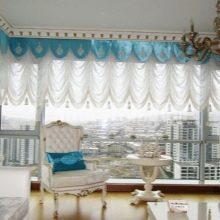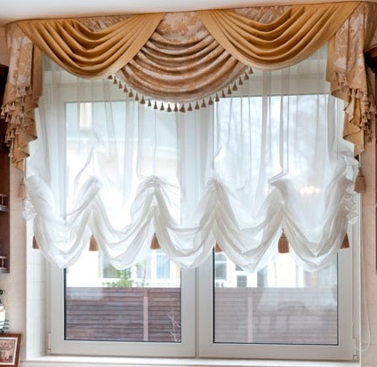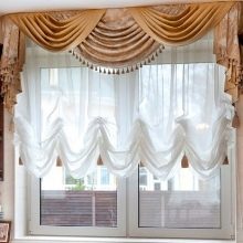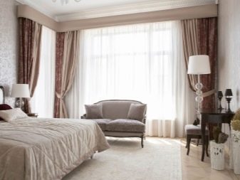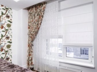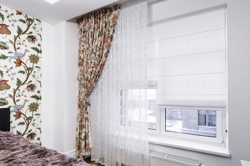 Geniş bir pencereyi vurgulamak için kombine perdeler kullanılabilir. Herhangi bir tekstil tonunu seçebilirsiniz - ana şey, renklerin genel tasarımla uyumlu olmasıdır.