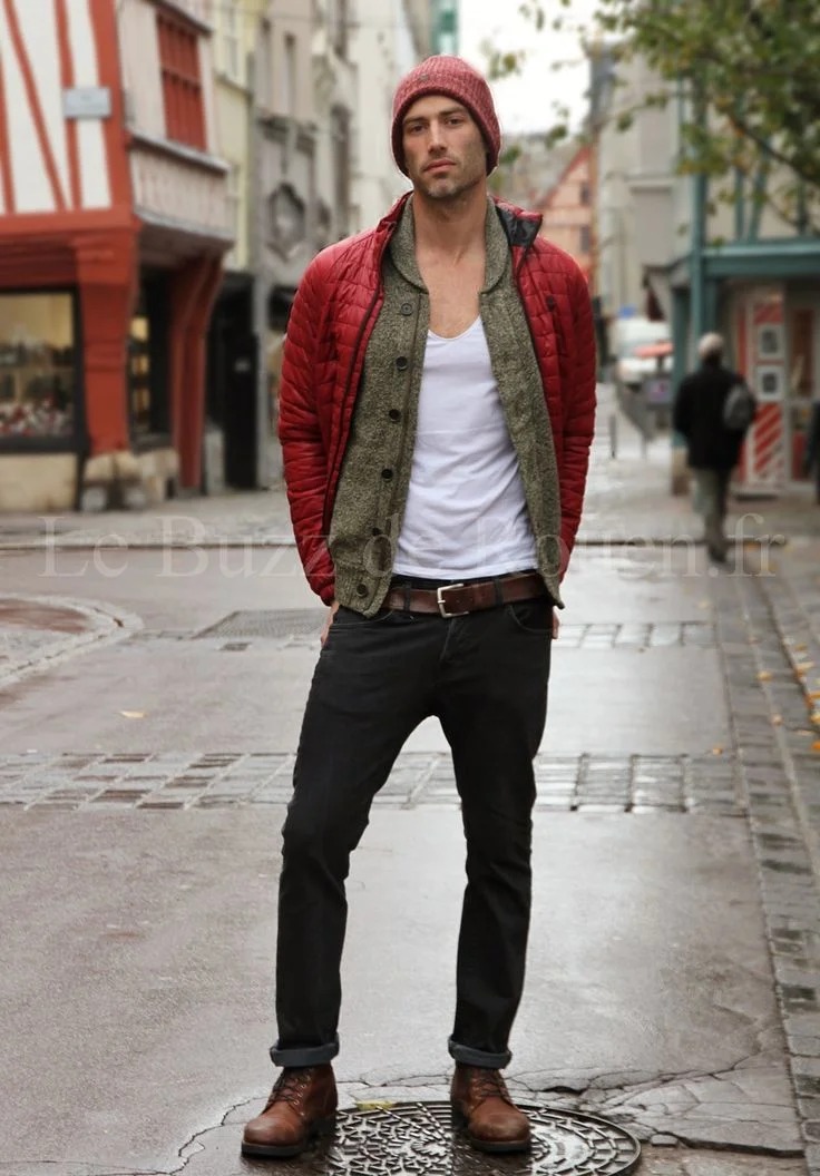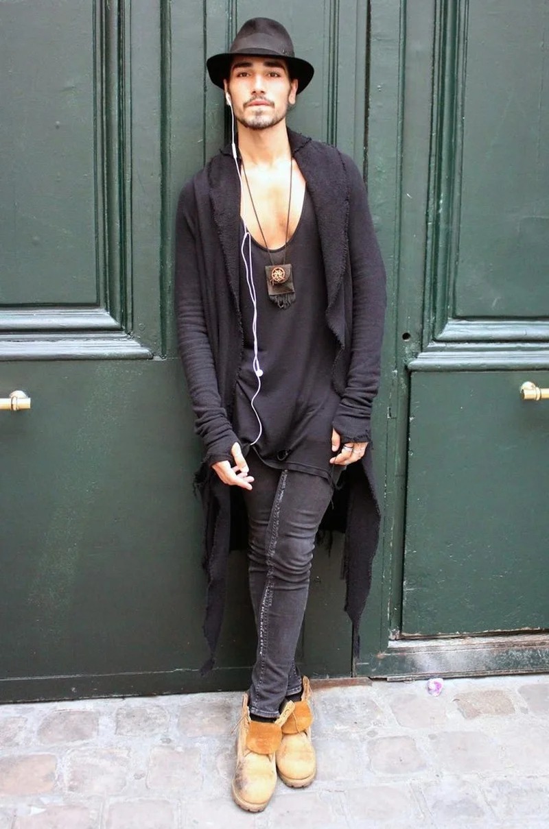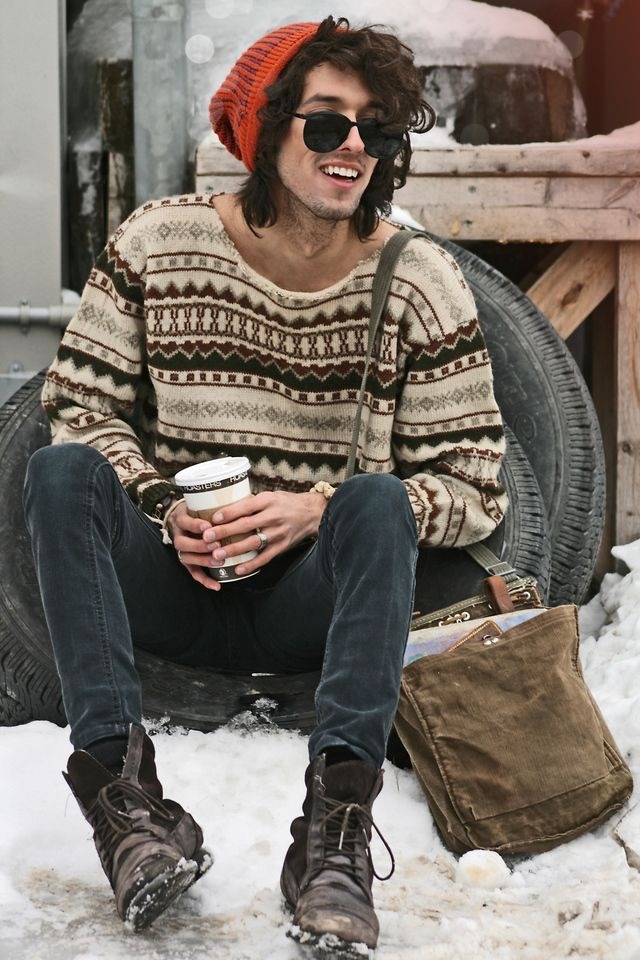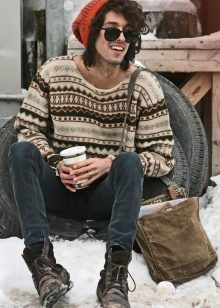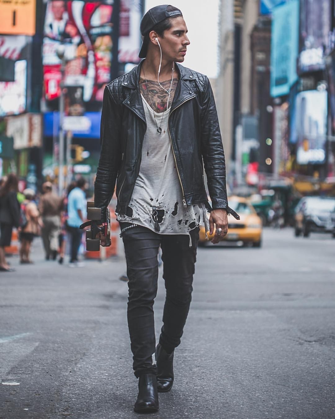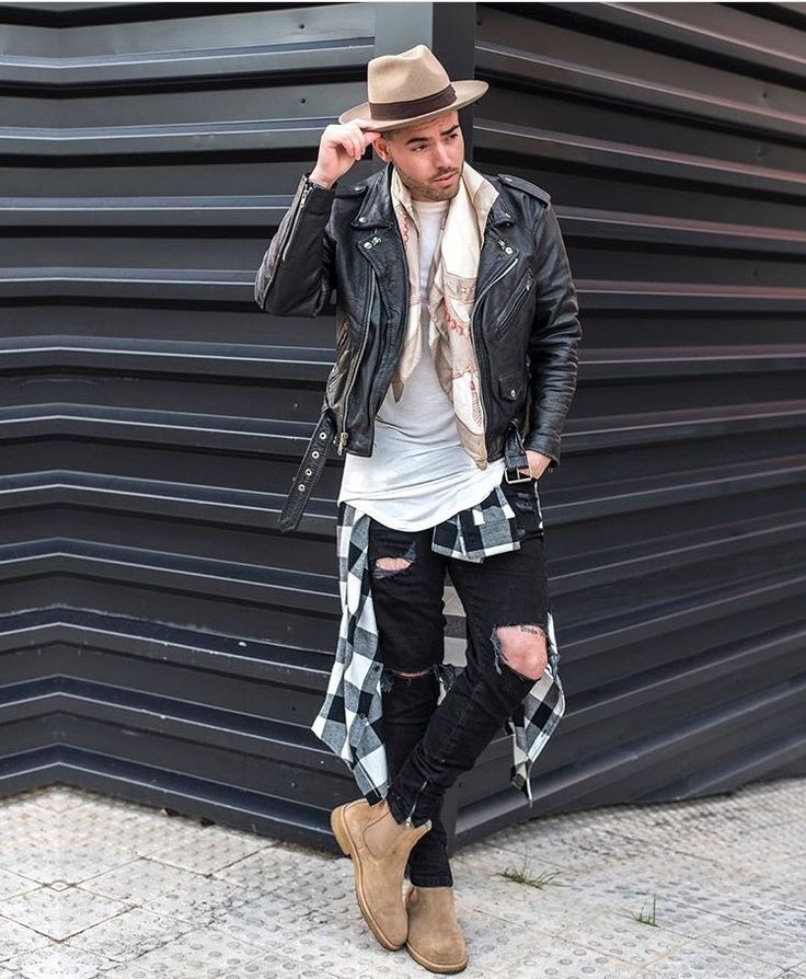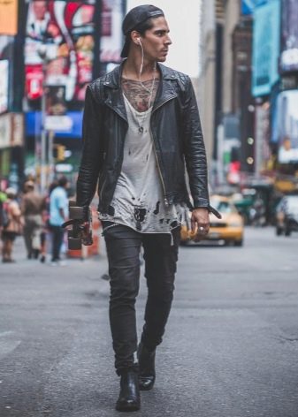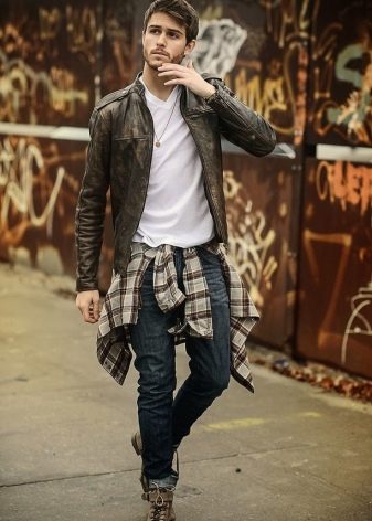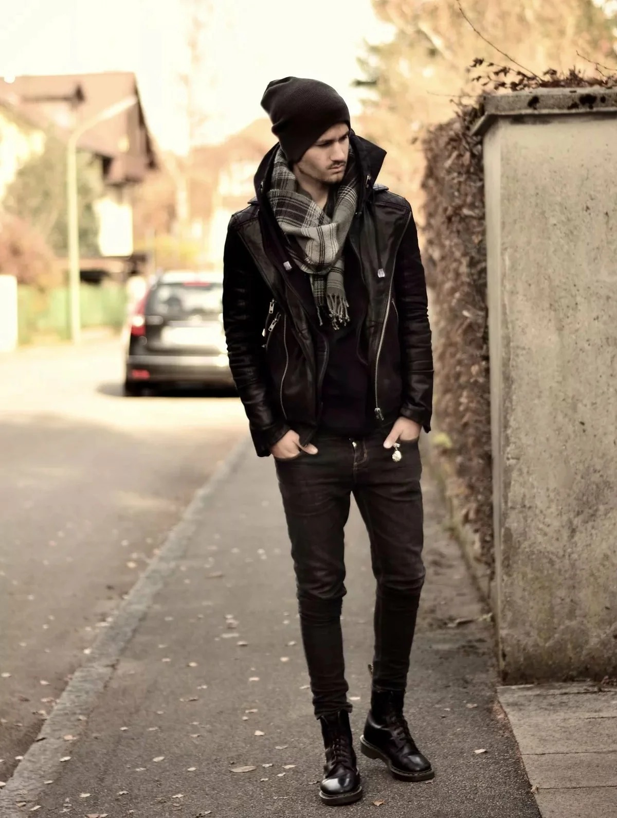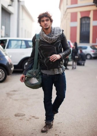 Büyük boy bir kazak, motorcu ceketi, yıpranmış ayakkabılar ve basit kot pantolonlar, erkekler için günlük kıyafetin harika örnekleridir.