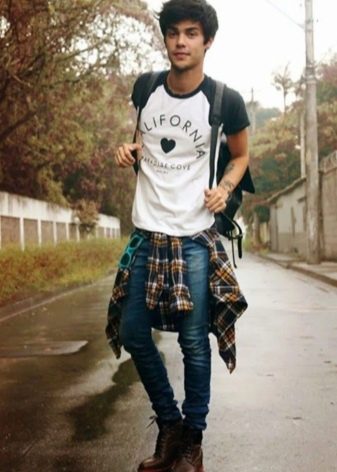 Farklı baskıları, logoları, renkleri birleştirmeye izin verilir, genel izlenim, görüntü üzerinde çalışılmamış gibi dikkatsiz olmalı, ancak elinize düşen ilk şeyi koymalısınız. Diğer stillerden detayları görsele dahil edebilirsiniz, eklektizm, grunge'ın karakteristik özelliklerinden biridir.