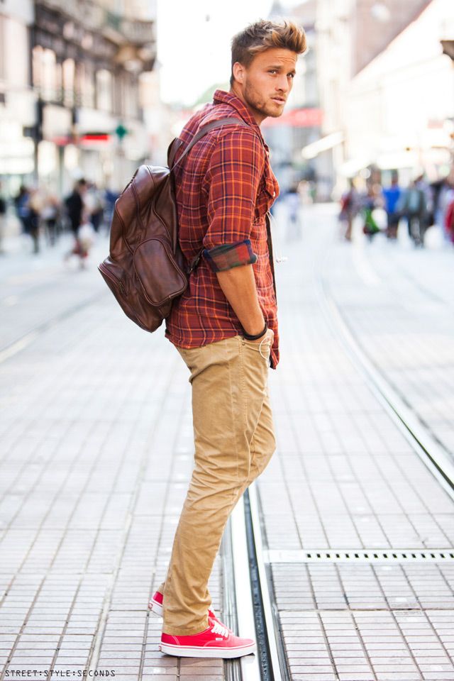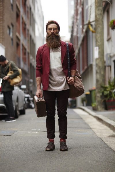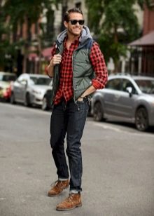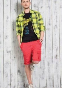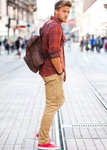 Parlak şık bir görünüm oluşturmak oldukça basittir. Örneğin, gerçek bir hipster gibi görünün. Kahverengi pantolon, kırmızı gömlek, hafif tişört burada mükemmel bir şekilde kombinleniyor. Ayakkabılardan - parlak renkli çoraplarla kaba koyu renkli botlar.