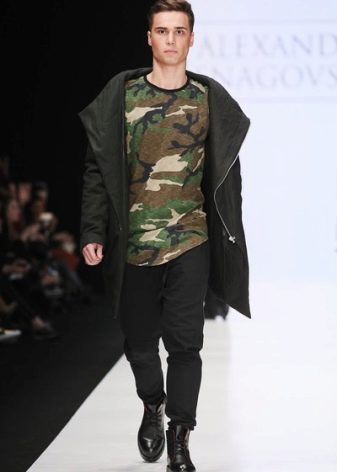 Askeri tarzda giyinmek, tüm kıyafetlerin profesyonel bir paralı asker gibi görünmesi gerektiği anlamına gelmez. - son derece koruyucu bir gölge. Modaya uygun bir gardırobun unsurları, diğer şeylerle mükemmel bir şekilde birleştirilebilir, örneğin: hafif bir jumper ve koyu renkli bir ceket ile kamuflaj pantolon, mavi kot pantolon ve puantiyeli bir gömlek ile karakteristik bir renkte bir ceket.