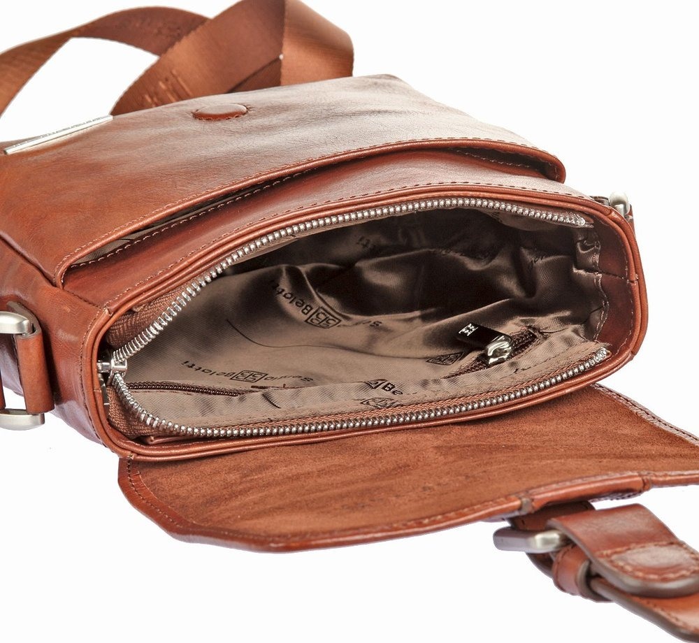 Kapak kapağı iki mıknatısla sabitlenir. Kapağın iç tarafı deri çerçeve içinde pamukludur. Astarı kırmızı pamukludur. Zarif armatürler pirinçten yapılmıştır ve beyaz bir kaplamaya sahiptir. Bir büyük iç bölme ve 2 cep. Ek düz ön cep. Uzun kumaş omuz askısı bir toka ile rahatça ayarlanabilir.