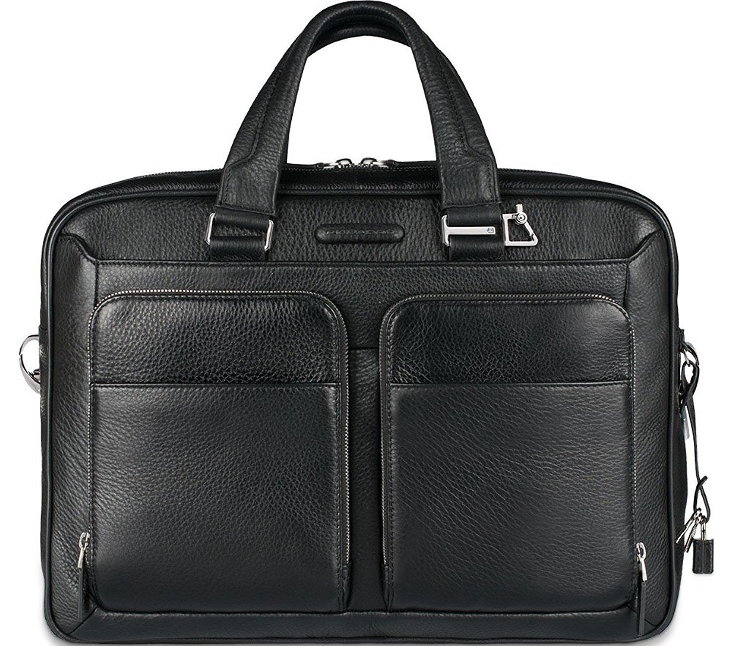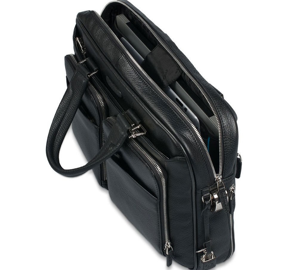 Siyah kabartmalı deri dikey çanta. Dikdörtgen düz model, fermuarlı ve ayarlanabilir kumaş omuz askılıdır.Önde ve arkada fermuarlı cepler ve altta imzalı Piquadro eki. İçeride ayrıca fermuarlı bir cep, kulaklık jakı ve cep telefonunuzu saklamak için çıkarılabilir bir kılıf var.