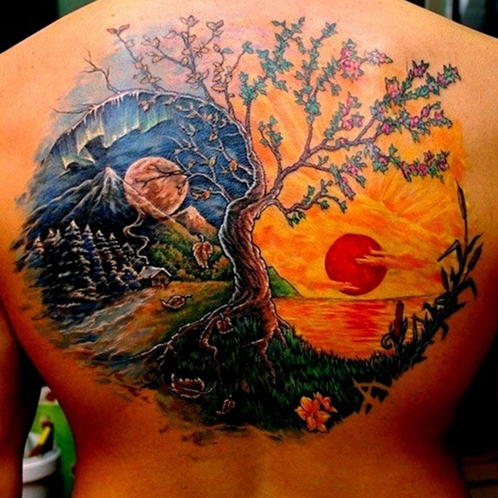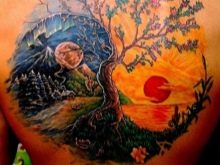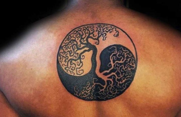 Böyle bir dövme taslağı da popülerdir, burada işaretin iki yarısı ağaç şeklinde görünür. Bunlardan biri, kural olarak, siyah renklidir, ancak gündüz büyür. İkinci ağaç beyaz renklidir ve geceleri büyür.