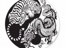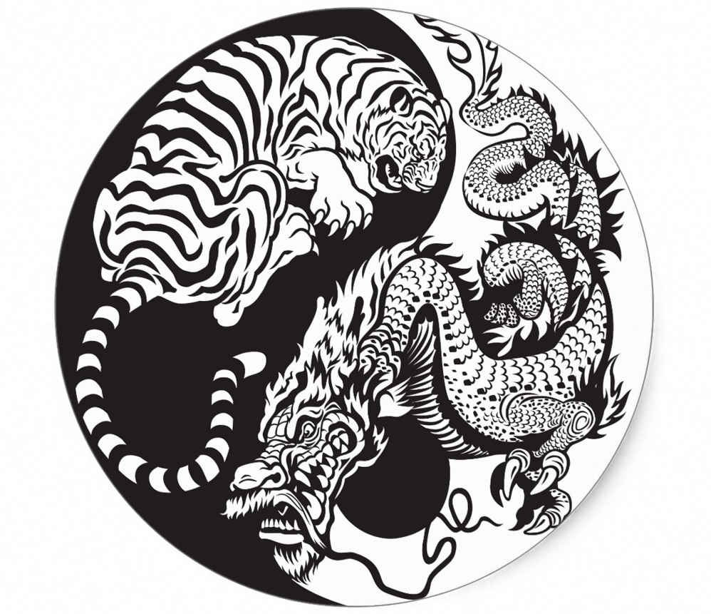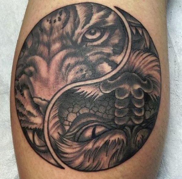 Yin-Yang dövmesinin böyle bir çeşidi de, iki zıt yarının iki hayvan şeklinde göründüğü yaygındır. Böyle bir vücut kalıbının anlamı, üzerinde hangi hayvanların tasvir edildiğine bağlı olarak değişebilir. Yani, kaplan ve ejderha, Yin-Yang olarak eril ve dişil sembolize edecek.