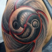 Genellikle, Yin-Yang, kafaları geleneksel sembolde de bulunan delikler yoluyla farklı alanlara giren iki yılan şeklinde de görünür. Böyle bir dövme, bir kişinin yeni bir şey deneme arzusu, hayatında henüz gözlemlenmemiş daha parlak duygular ve duyumlar arzusu anlamına gelir.