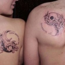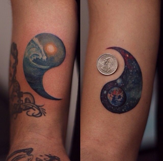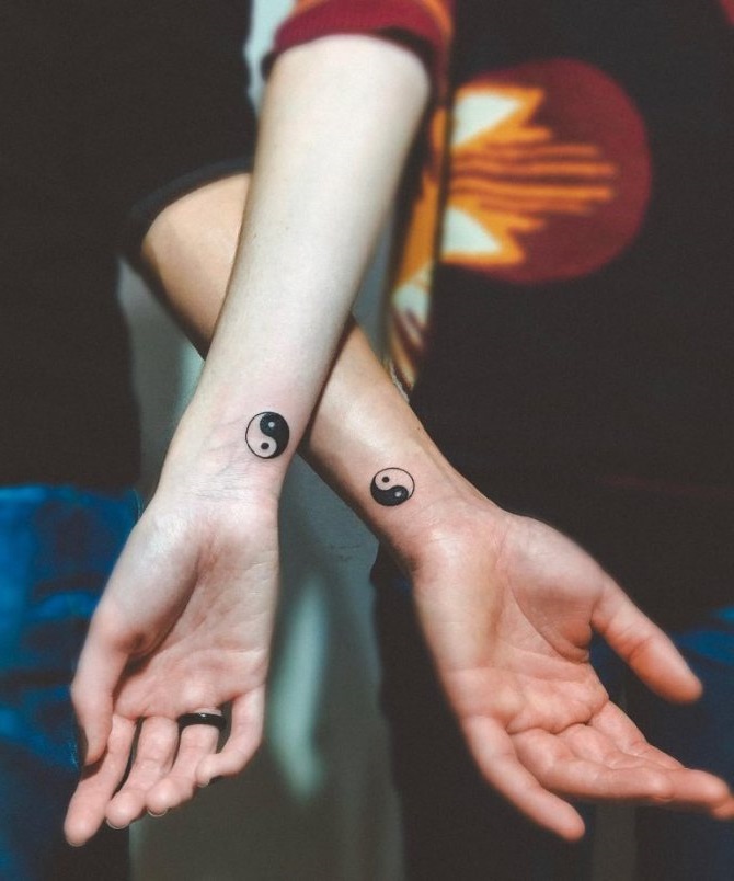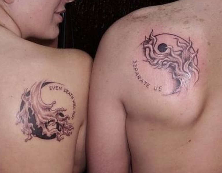 Genellikle Yin-Yang işareti, aşık iki kişi tarafından eşleştirilmiş dövmeler olarak da uygulanır. Böyle bir dövme, insanların ilişkilerinde uyumun hüküm sürdüğü anlamına gelecektir.Bazen aralarında ortaya çıkan tüm çelişkilere rağmen, birbirleri olmadan var olamazlar veya var olmak istemezler.