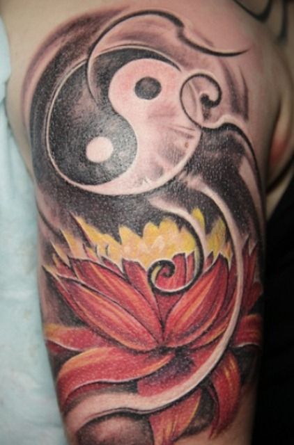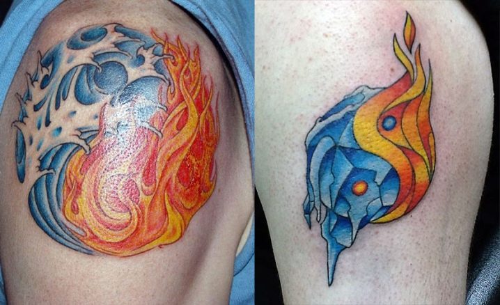 Böyle giyilebilir bir görüntü uygulamak için başka seçenekler de var. Bu nedenle, eskizler genellikle Yin-Yang'ın iki karşıt unsur şeklinde göründüğü yerlerde bulunur: ateş ve su. Böyle bir dövme özellikle Doğu kültürüyle ilgilidir, çünkü orada yaşayan şifacılar, insanların her birinin dört elementin hepsinden bir şeye sahip olduğuna inanırlar, ancak bu elementlerin parçaları genellikle eşit değildir.