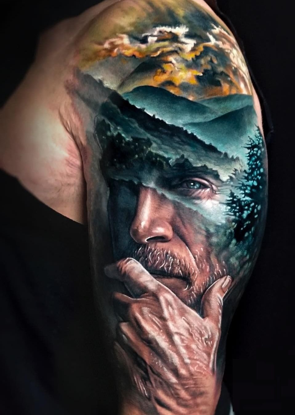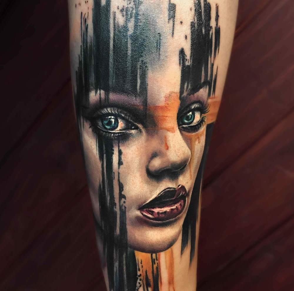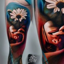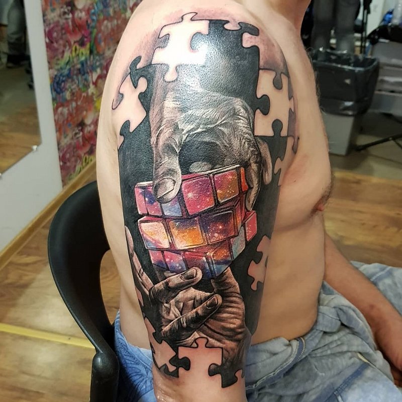 Çizimlerin tek bir desende birleştirildiği ilginç dövmeler. Bu durumda portre ve uzay temaları birleştirilebilir.
